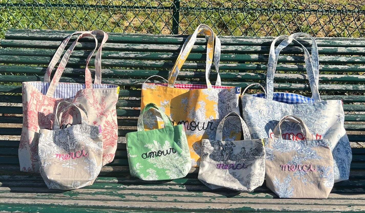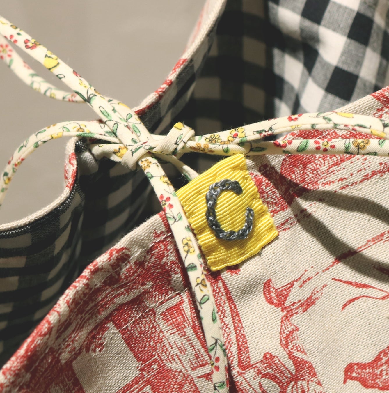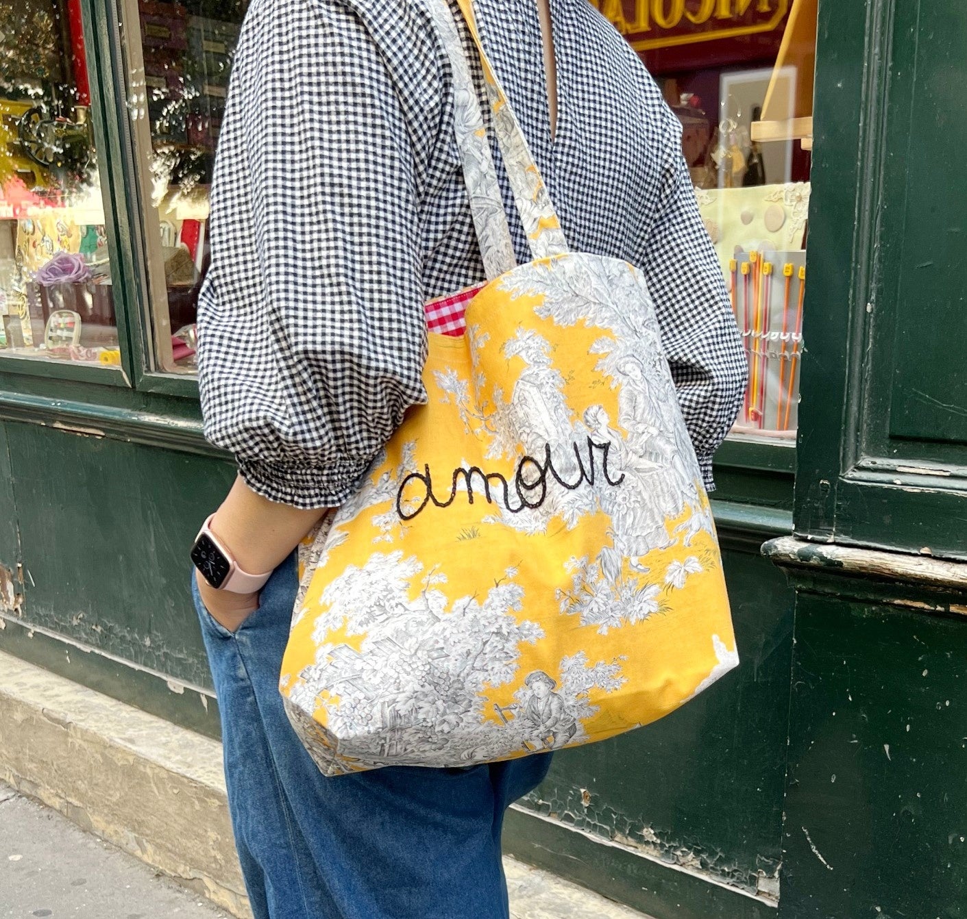 CHICABA × KAORI Embroidery のオリジナル刺繍トートバッグには、フランス伝統の生地「トワルドジュイ」を採用。“merci(ありがとう)”や“amour(愛) ”とフランス語で施された刺繍や、CHICABAのために特別に刺繍していただいた“C”の頭文字もポイント。生地の取り方で1点ずつ異なるバッグの表情や、遊び心のある裏地、“C” の刺繍の色やグログランテープまで、ひとつずつ異なるこだわりのデザインです。