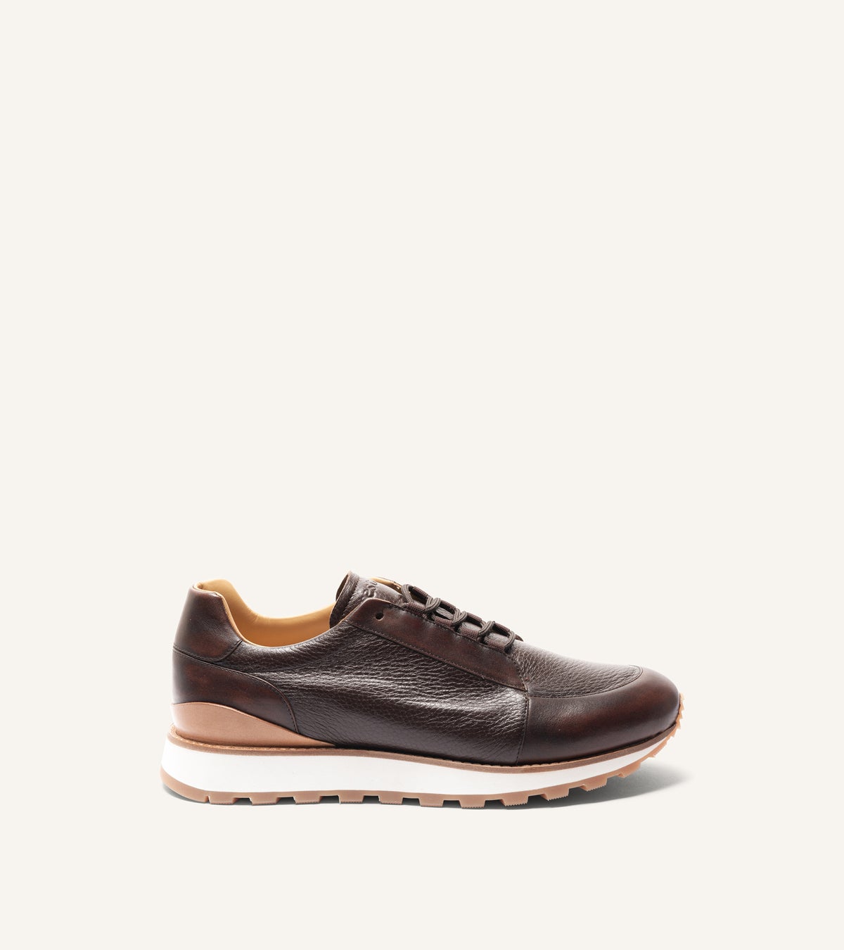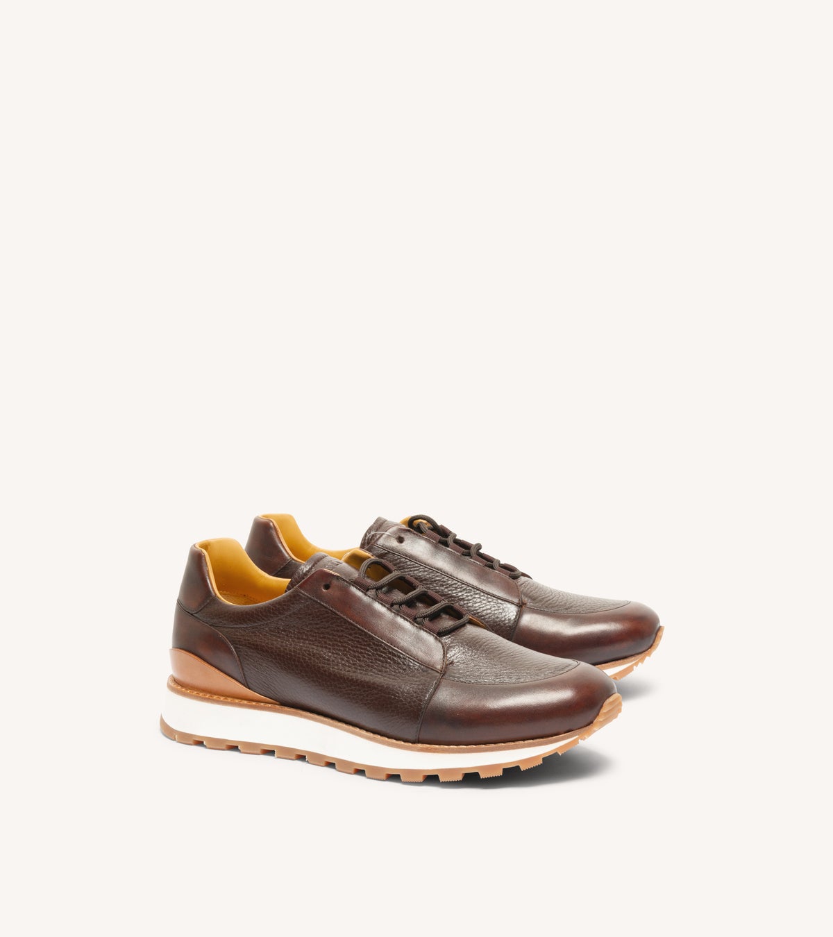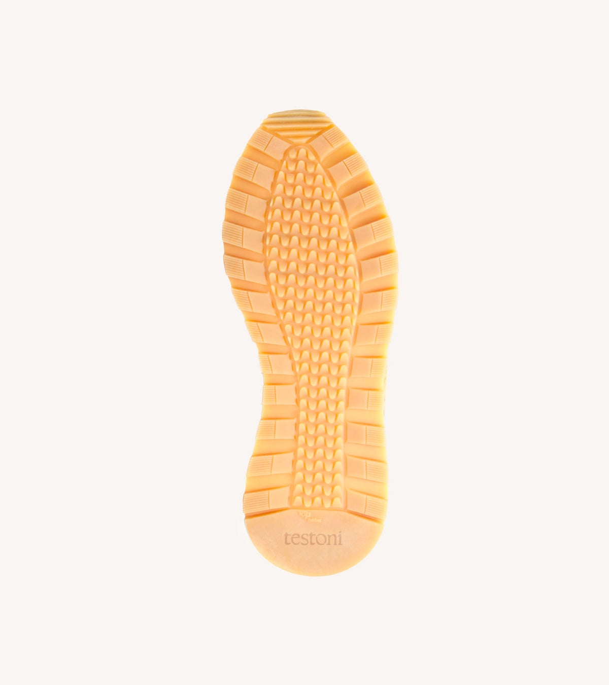 ホワイトとハニーを上品にミックスしたトレッドラバーソールと、ボロネーゼの「サケット」構造で補強した比類のない快適さと柔軟性を持つスニーカー。鹿革を用いたアッパーにより、足なじみのいい柔らかさが 特徴的です。インソールにtestoniのロゴをあしらったモエナスニーカーは、クラフツマンシップと革新的なデザインをシームレスに繋いでいます。