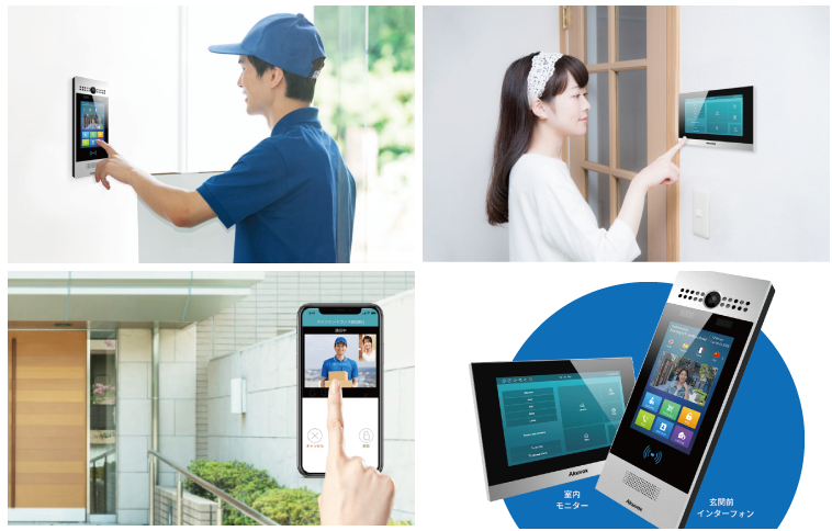 集合玄関機は「顔認証」「ICカード認証」「QRコード認証」「時限式暗証番号認証」など様々な解錠方法が可能です。また、室内モニターからの通話・解錠だけでなく、専用のアプリを利用することで、入居者が所有するスマートフォンで外出先から来訪者と応答でき、訪問履歴の確認、不在時の訪問者の画像確認など様々な機能を持たせることが可能となります。また、クラウドサービスを利用することにより、入居者へのメッセージ通知機能や時限式の暗証番号・QRコードの発行機能により対面での鍵の受け渡し作業を不要にする等、不動産管理会社における業務効率化ツールとしての利用も可能となっております。