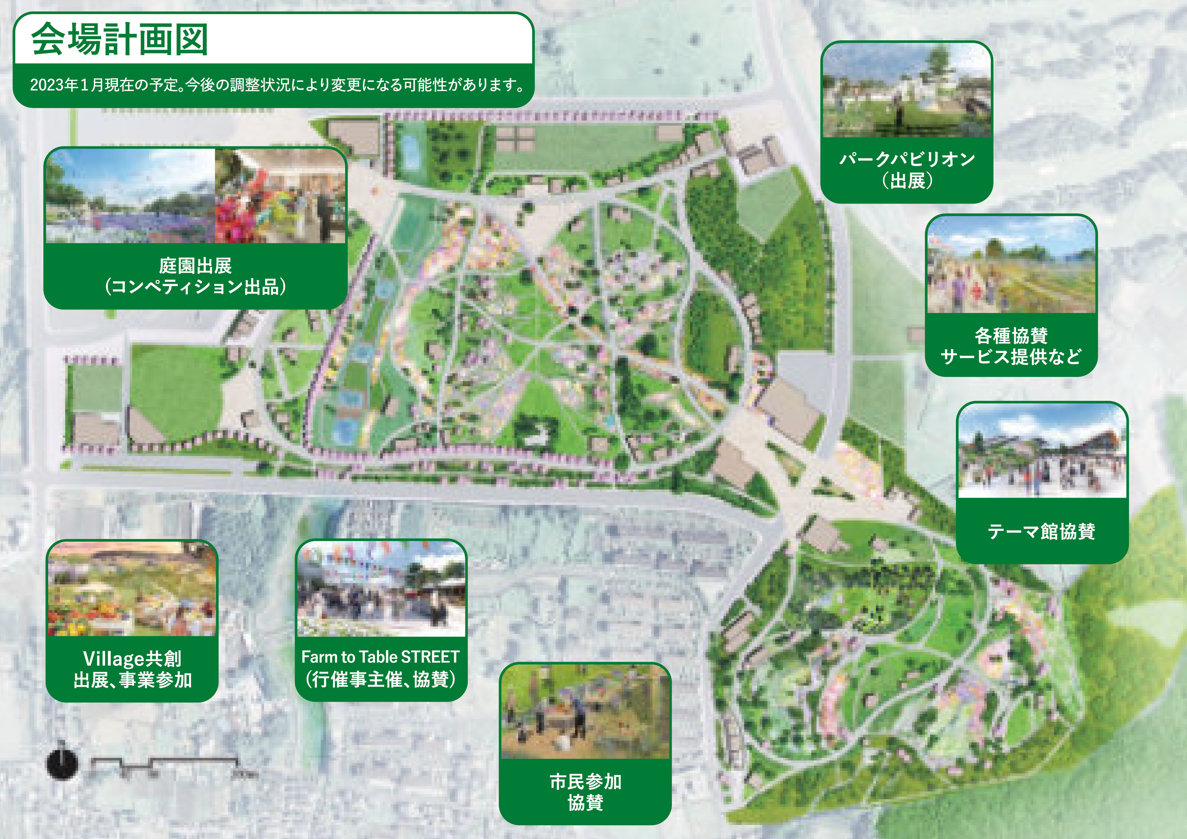 2050年グリーン社会を見据えて「Well-being」「Farm&Food」などをテーマに展開を検討中。企業様にとっては、Villageをグリーン社会実現のための大地の実験場として、新たな事業実証や目指す企業の未来を発信する場として、企業ブランディング、プロモーション、新規事業PoCなど、実メリットの高い形で参加いただける形を構築していきたいと考えています。また、出展事業以外にも行催事参加や協賛参加など多様な参加メニューを提供してまいります。