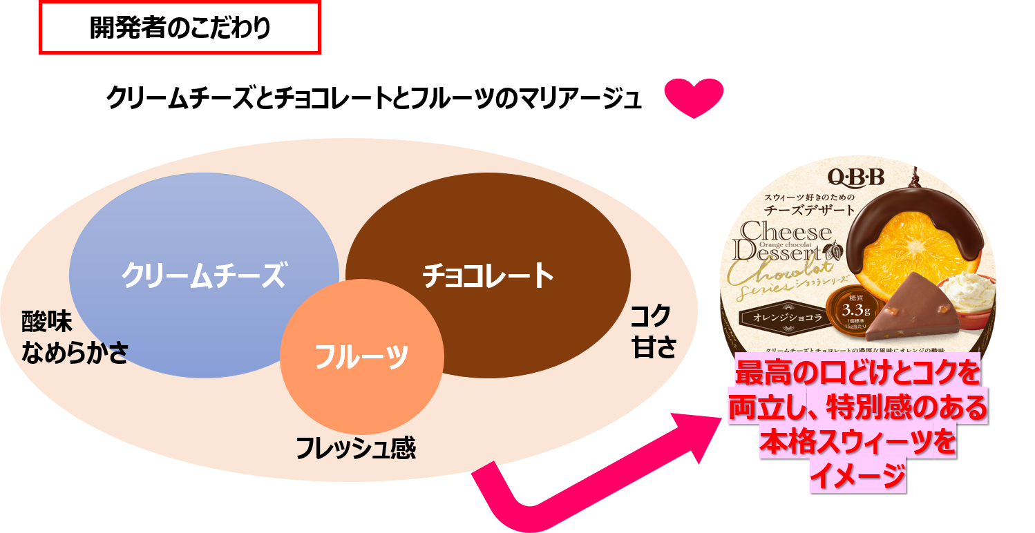 当社は、これらのお客様のニーズにお応えし更なる「罪悪感のないデザート」を目指して「チョコレート好きのためのチーズデザート」を考案。昨今の菓子のなかでも市場の伸び率や専門ショップの増加から「チョコレート好き」が増加傾向にあると推定し、本商品の企画につながりました。実に100回以上の試作を重ねて完成した「オレンジショコラ」は、最高の口どけとチョコレートのコクを両立し、オレンジの風味が爽やかな「自分への手軽なご褒美」としてお客様においしい時間を提供します。チーズデザートが好きなお客様はもちろん、チョコレート好きのお客様にも喜んでいただける商品です。