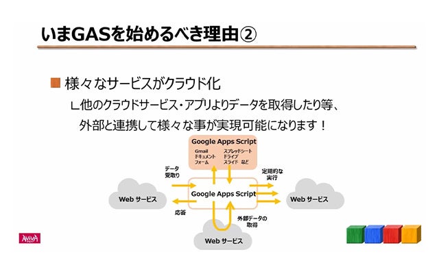 GASを複数のGoogleアプリ(メール、ドライブ、チャット、カレンダー等)を連携・自動化するための基本的なスキルと知識を学習します。