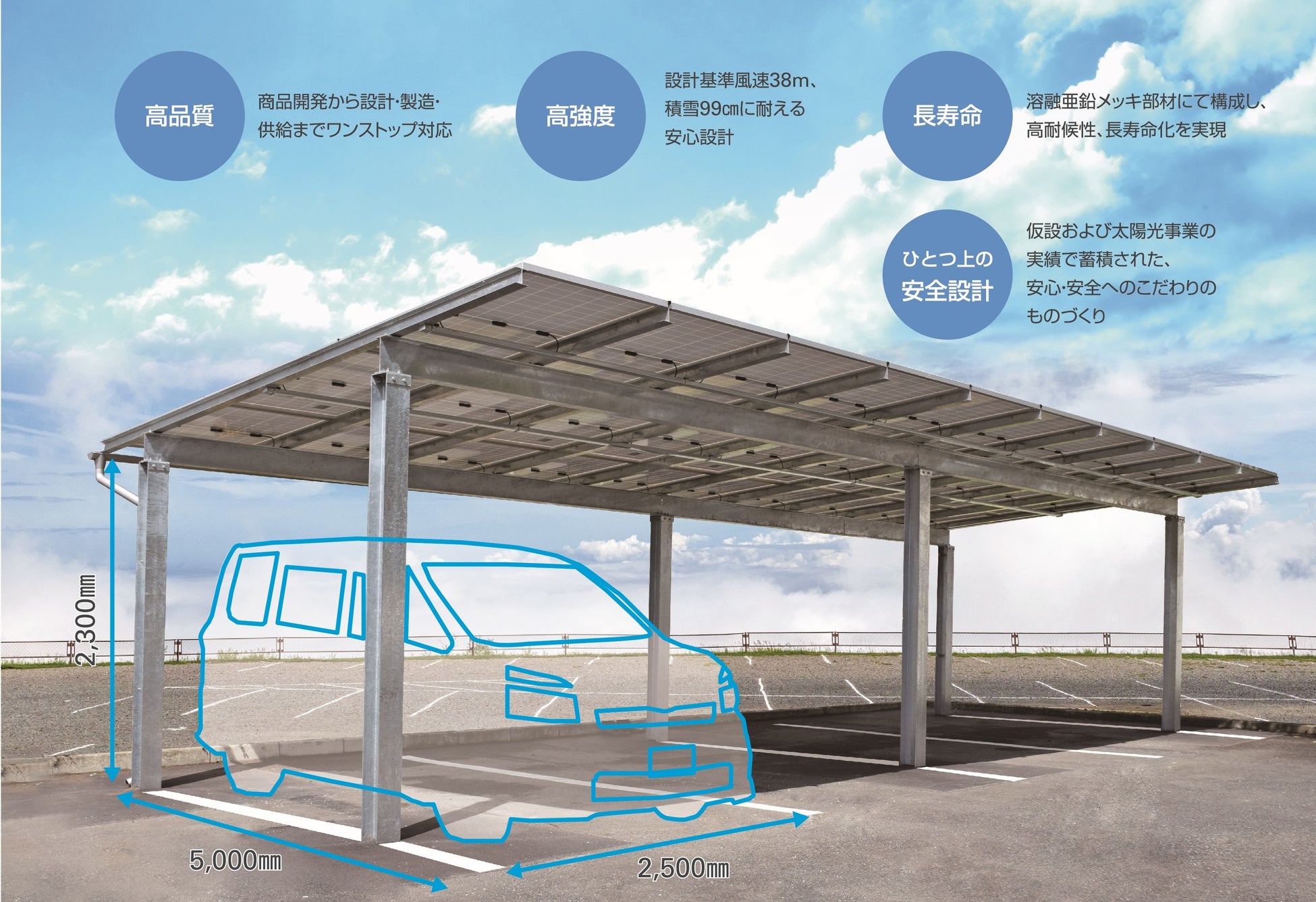 また別途、屋根葺材 (金属鋼板)を搭載したソーラーカーポート架台もラインナップがございます。建築確認申請等において屋根葺材(不燃材)の搭載を指定された場合には、こちらのタイプをご用命下さい。