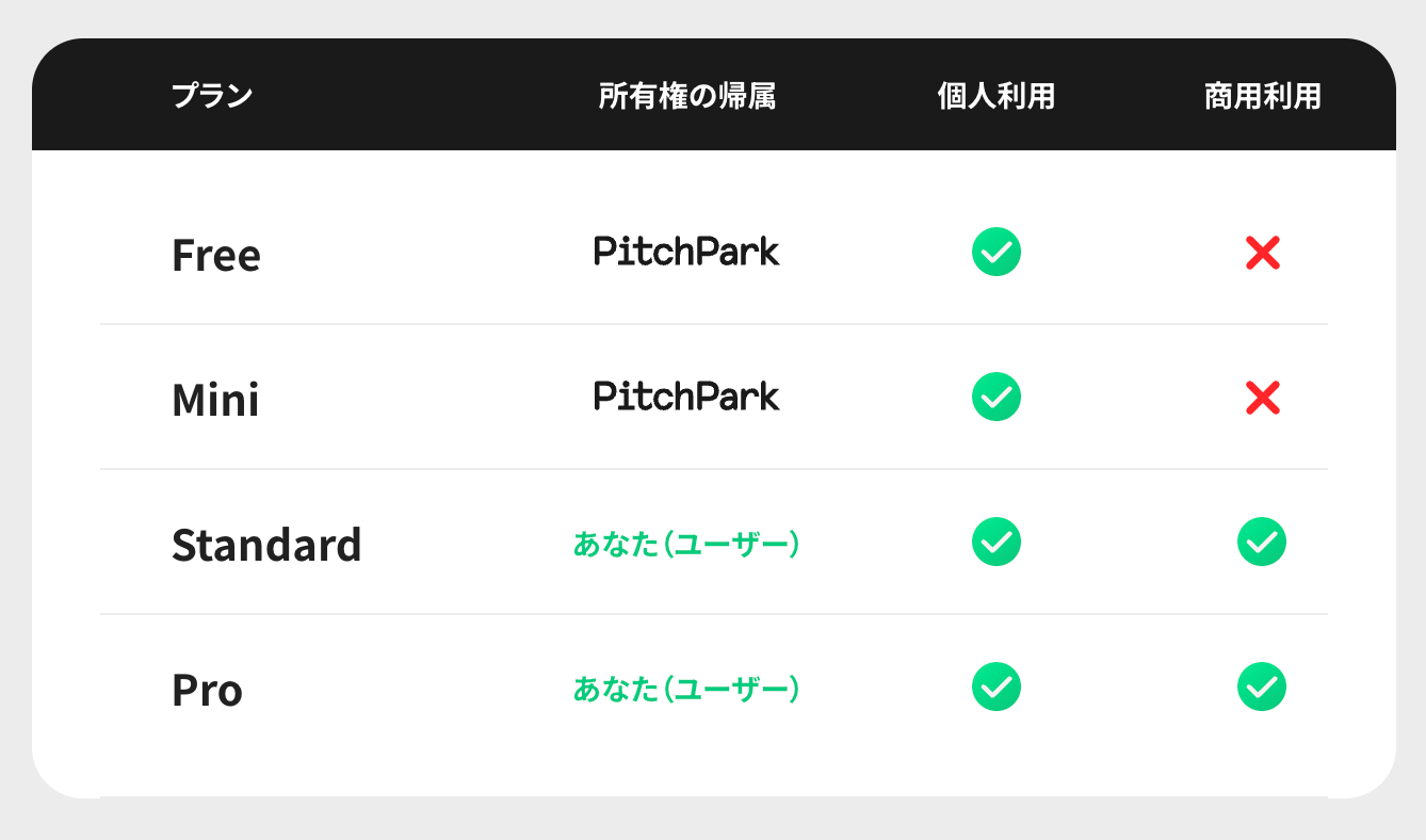 ※ PitchPark内での所有権とは、著作権とは異なりPitchPark内でのページを利用できる権利です。