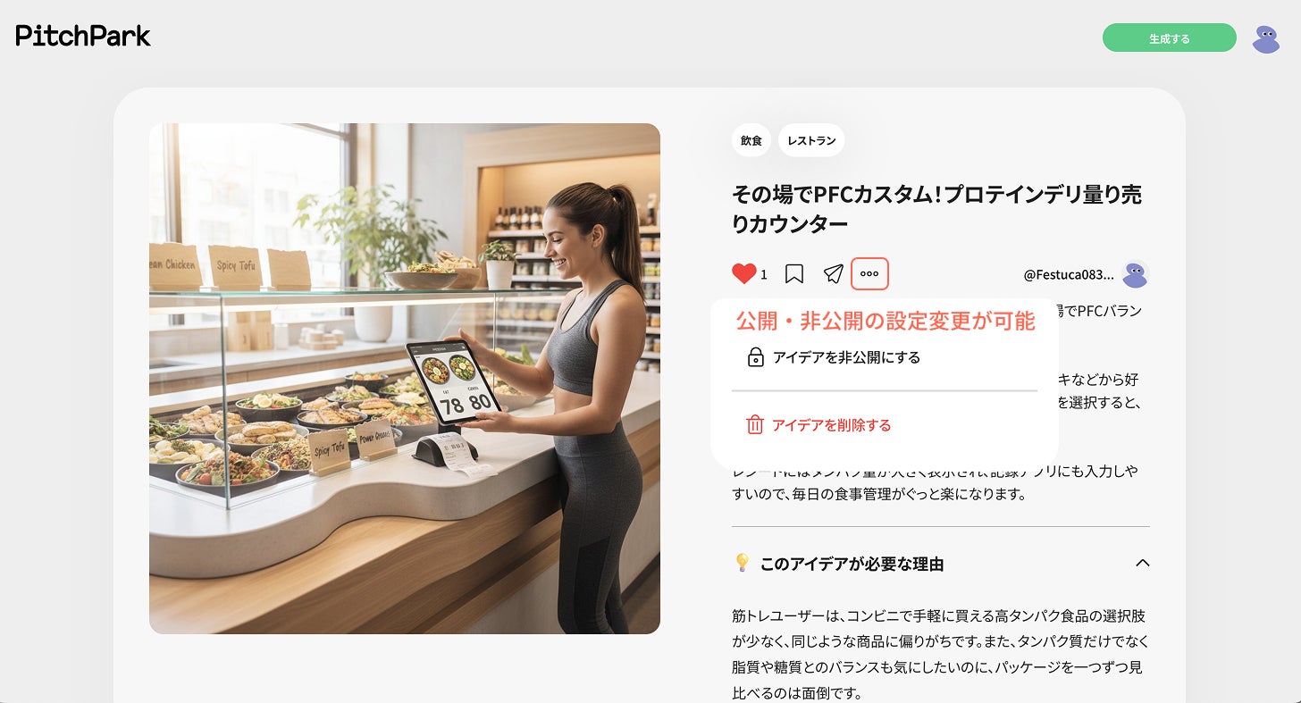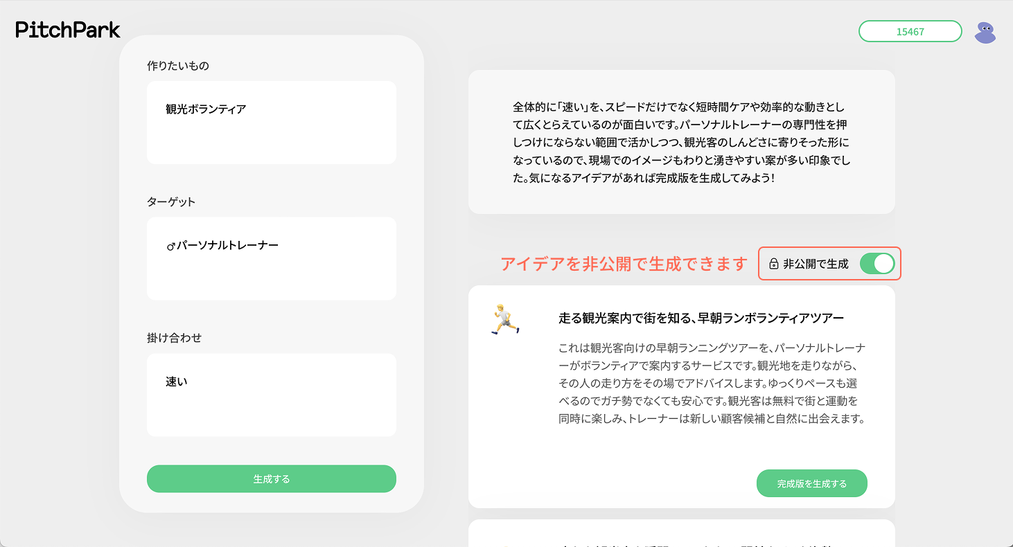 多くのご要望にお応えし、アイデアを非公開のまま生成・保存できる機能を実装しました。これにより、副業のサービス企画、フリーランスのクライアントワーク、個人事業や社内プロジェクトのアイデア出しなど、まだ誰にも見せたくない段階のアイデアを、個人から法人まで安全に育てることができます。