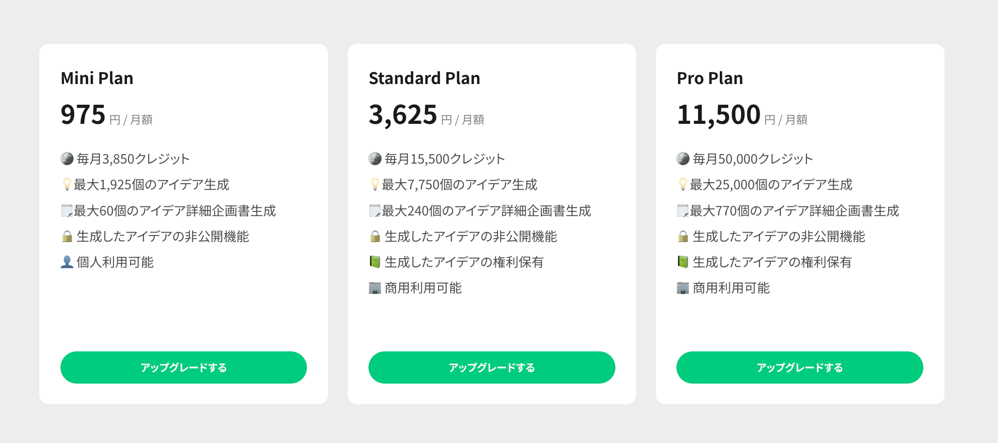 全プラン共通で学習・研究・個人プロジェクトなど、商用を伴わない個人目的での閲覧・保存・活用が可能です。Standard・Proプランでは生成したアイデアの商用利用が可能です。クライアントへの納品、企画書への組み込み、自社サービス・商品への活用など、ビジネスでの利用も自由です。