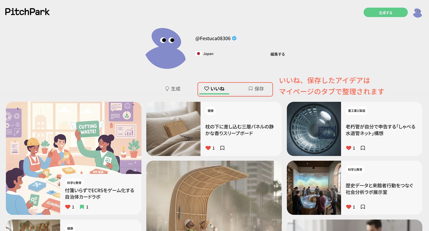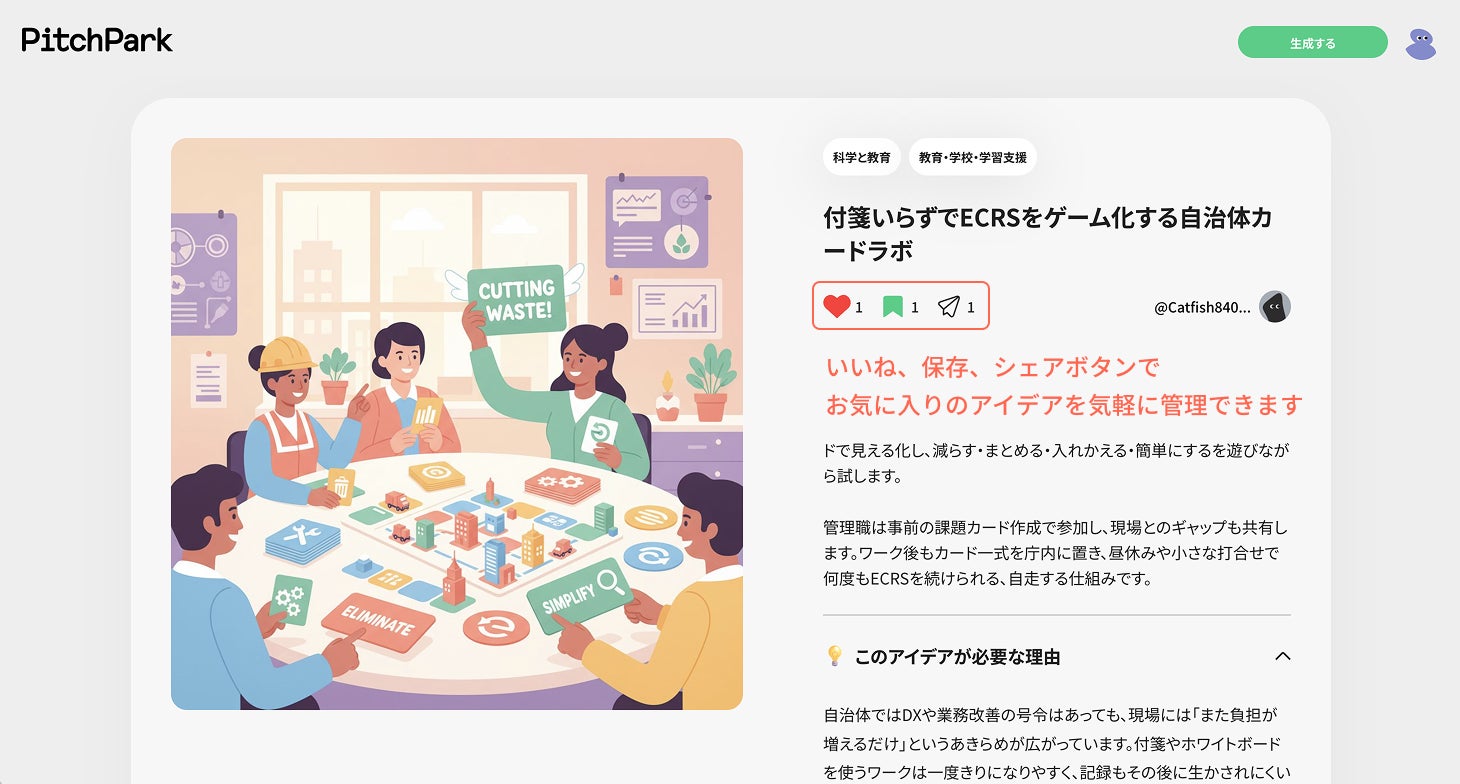 他のユーザーの公開アイデアに対する「いいね」や「保存」機能がより直感的に。他者の発想からインスピレーションを得て、それを自らの企画に応用していく「ひらめきの循環」を加速させます。