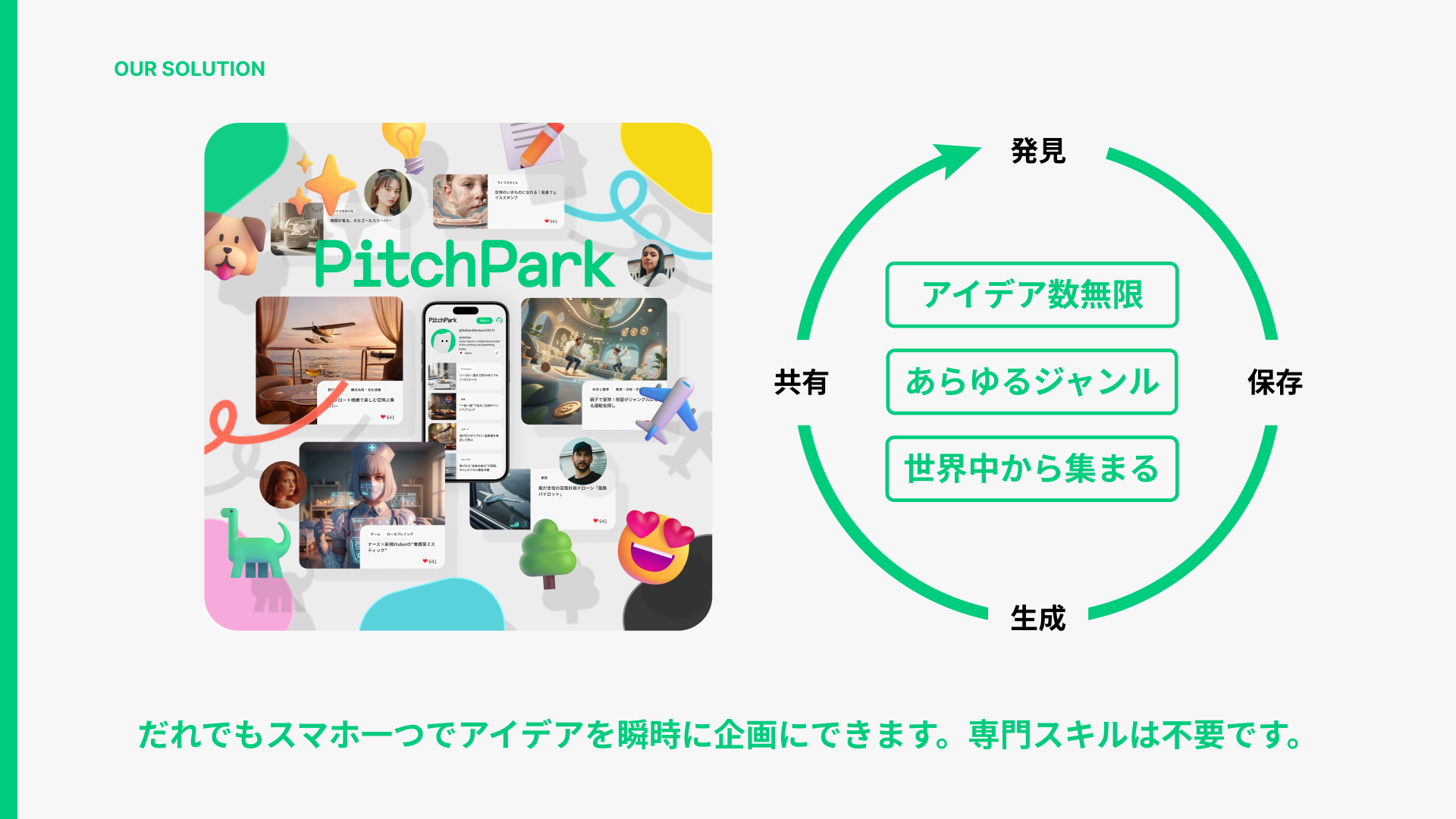 この循環によって、ユーザーの創造が連鎖的に広がっていく構造を持っています。PitchParkは、無限にアイデアが生まれ続ける"妄想と創造があつまる広場"です。