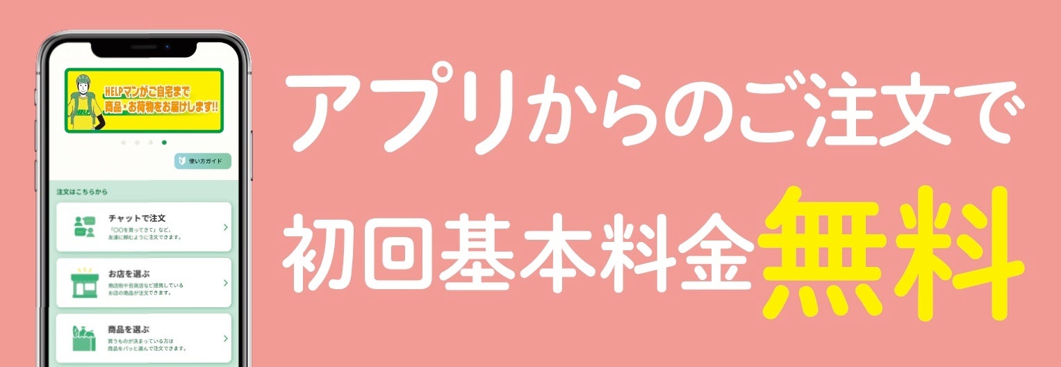 HELP!アプリのダウンロードで、初回基本料金無料クーポンを配布しているため、お客様ご指定商品の代金だけでサービスが使えます。ぜひ一度「HELP!」をお試しください!