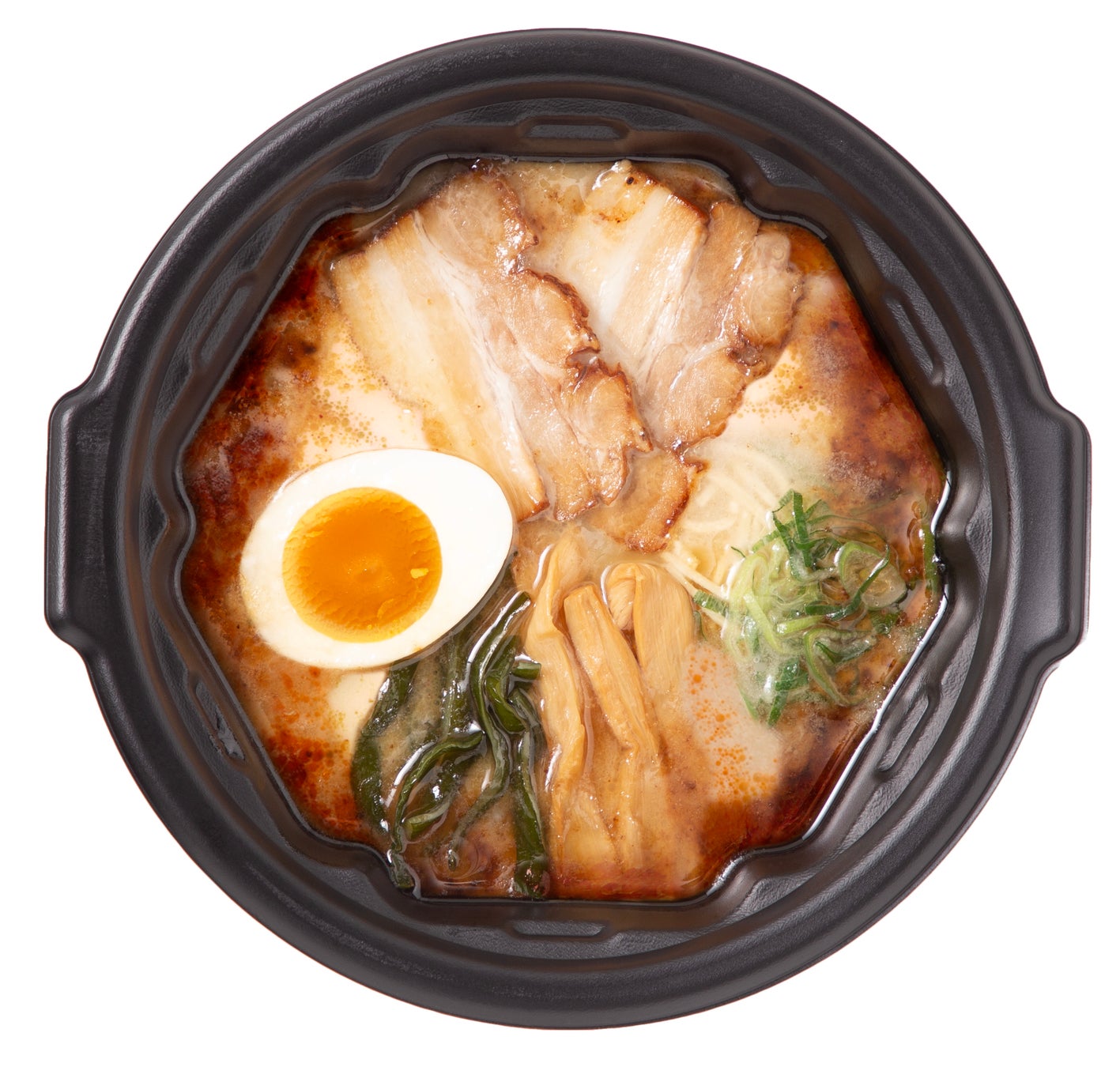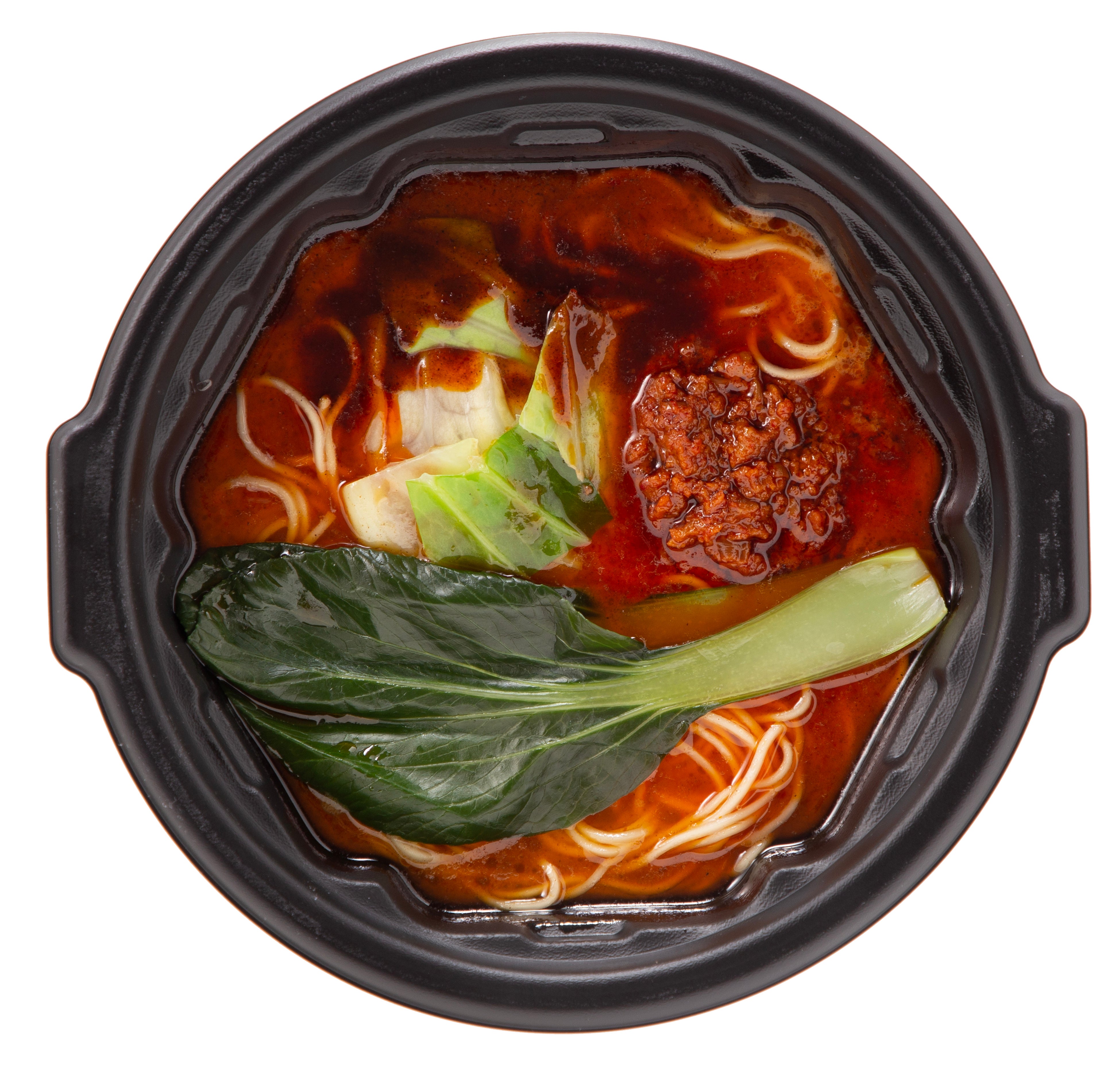 『IPPUDO スパイシー坦々麺』は、一風堂新宿ルミネエスト店で限定販売されたメニューをアレンジしたもの。実は動物性由来の材料を一切使用していませんが、特殊な製法でつくったまるで豚骨のような味わいのスープ、大豆を加工した肉味噌のようなトッピングと、調味油が混ざり合い、エスニックな辛みが楽しめる一杯です。別添の辣油でさらに辛みを追加できます。