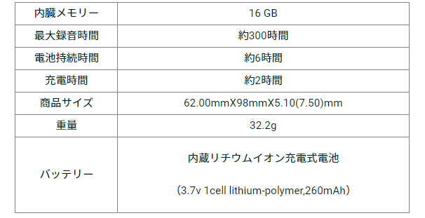 16GBの大容量バッテリー、最大300時間保存可能、スマートなデザインで違和感なく使用可能、簡単なスライドボタンでON/OFFが可能、高音質な録音が可能なので、持ち運びにもおすすめです。