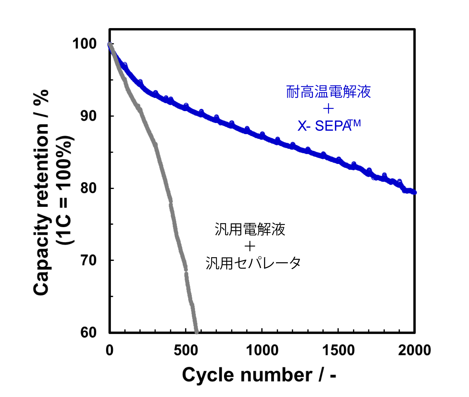 現在実施中の60℃での充放電サイクル試験の中間結果では、汎用の電解液とセパレータを採用した電池に対し、X-SEPA™と耐高温電解液を採用した電池は、2,000サイクル到達時点で容量保持率が大幅に向上していることが確認されています。また、電気自動車用途で一般的な容量保持率80%のエンド・オブ・ライフを設定した場合、寿命が約5倍に延びます。
