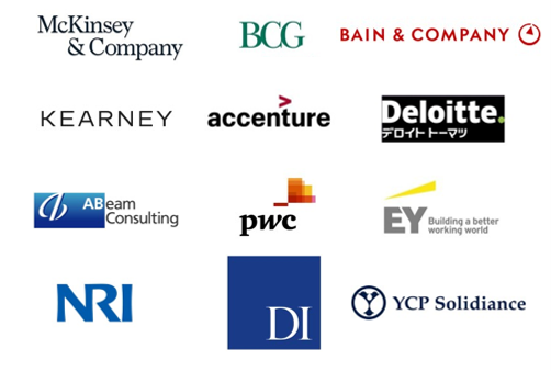 - 戦略・総合コンサルや投資銀行等のプロフェッショナルファーム出身者、海外MBAホルダーが豊富