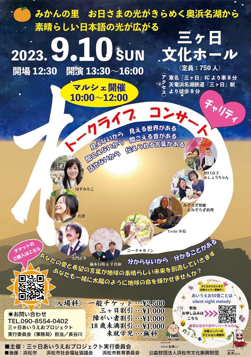 三ヶ日あいうえおプロジェクト実行委員会【事務局:浜松市北区三ヶ日町、代表:長谷川由美子(アーティスト名はすみちこ )】が企画する光の言葉「わ」トークライブコンサートは、2023年9月10日(日)開演13時30分〜16時(12時30分開場)三ヶ日文化ホール(750名定員)にて開催いたします。