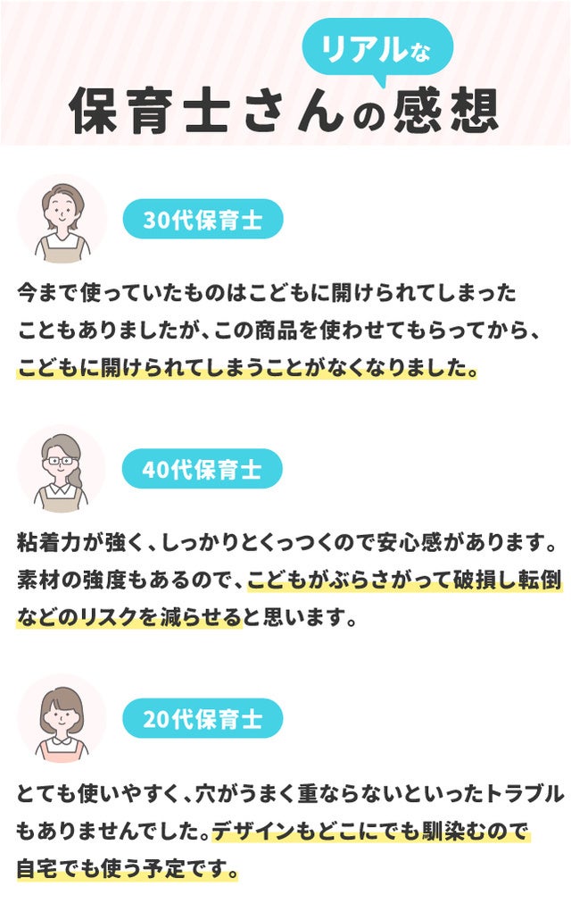 ドア開放防止ストラップを一番使い、知り尽くしている保育士さんたち(17名)に、数か月使用してもらい感想を聞きました。