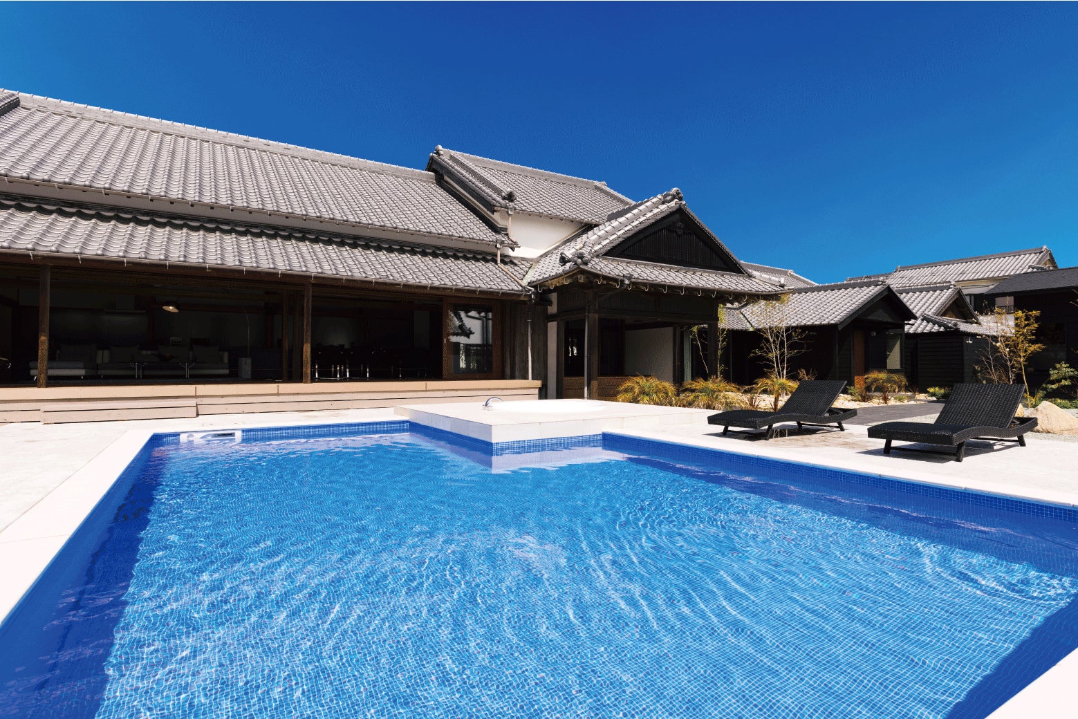 広さ約400坪の敷地を有する、Wellis Villa Awaji。敷地内はリビング棟・宿泊棟・レストラン棟の3つの棟からなり、庭にはプールやジャグジーを設置。130年の歴史を感じながらラグジュアリーな唯一無二の体験と非日常を味わえる他に類をみない空間を提供いたします。建物の再生には、当Villaが元々持ち合わせていた明治時代の建築の力強さは残し、ガラスや鉄という近代的な材料を採用し、木造建築の躯体と現代的な技術の美しさの対比を実現。文化的かつ快適な宿泊施設として再生することに成功いたしました。