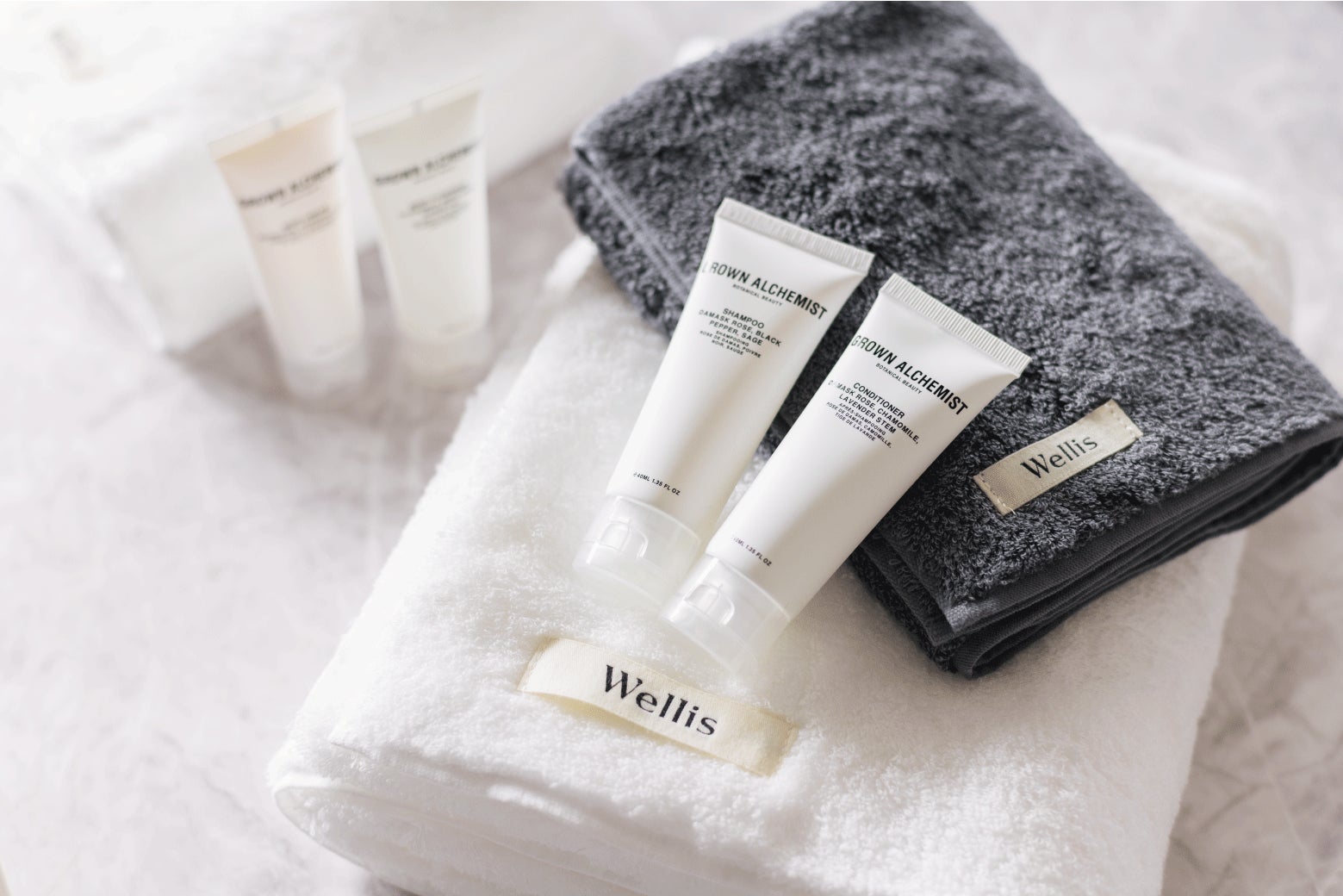 ライフスタイルブランド「Wellis」のタオルをご準備してお客様をお待ちしています。旅先での疲れを癒したお風呂上がりや、朝起きて顔を洗った後に、Wellisの『極上の肌心地』をお楽しみください。