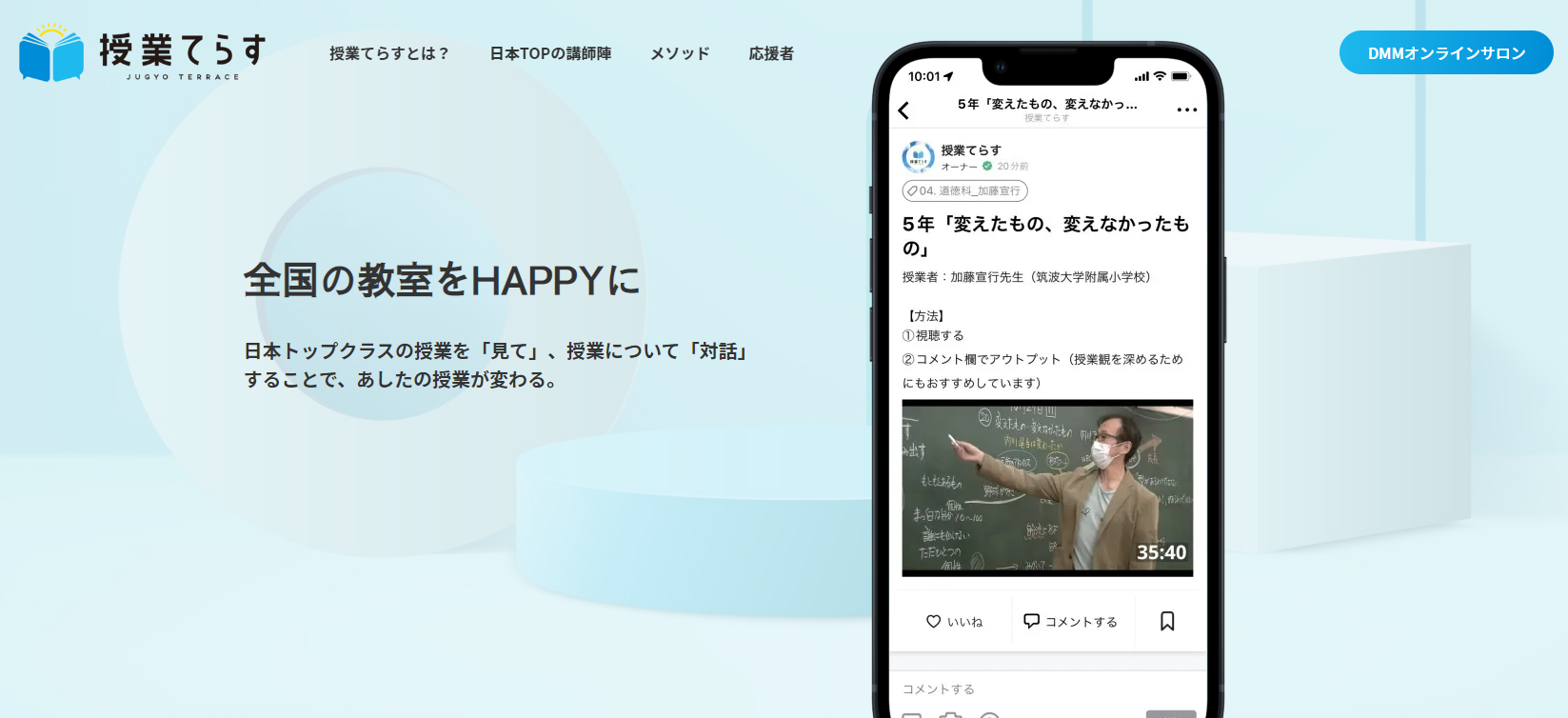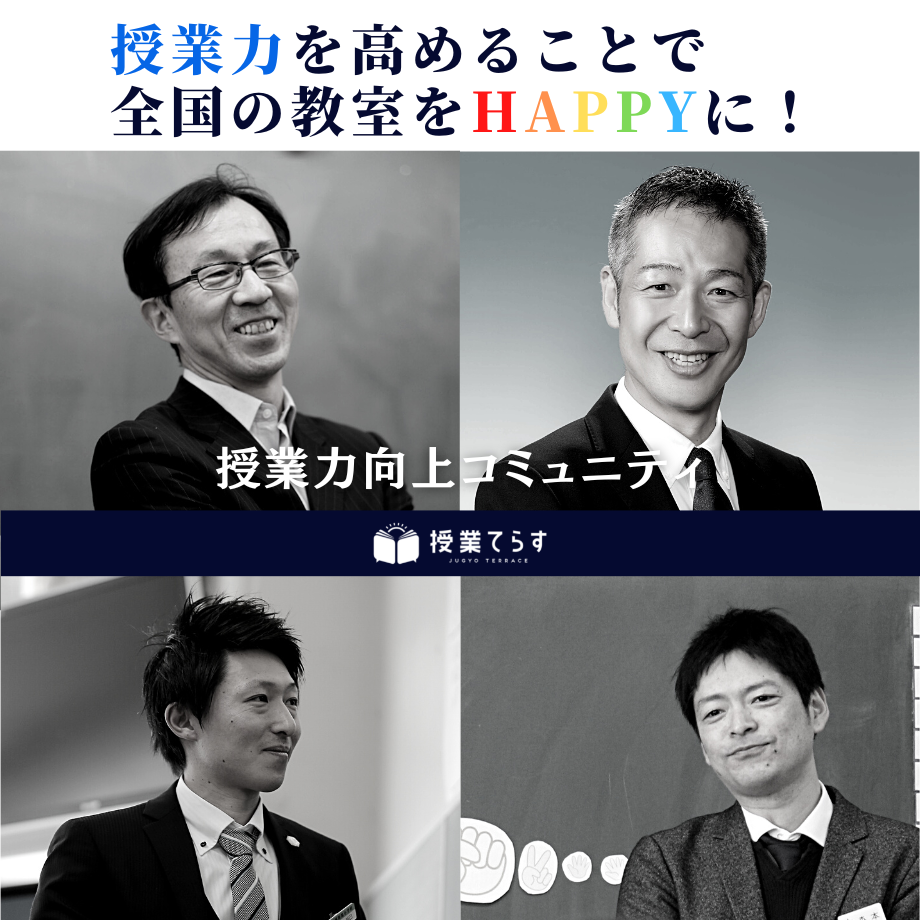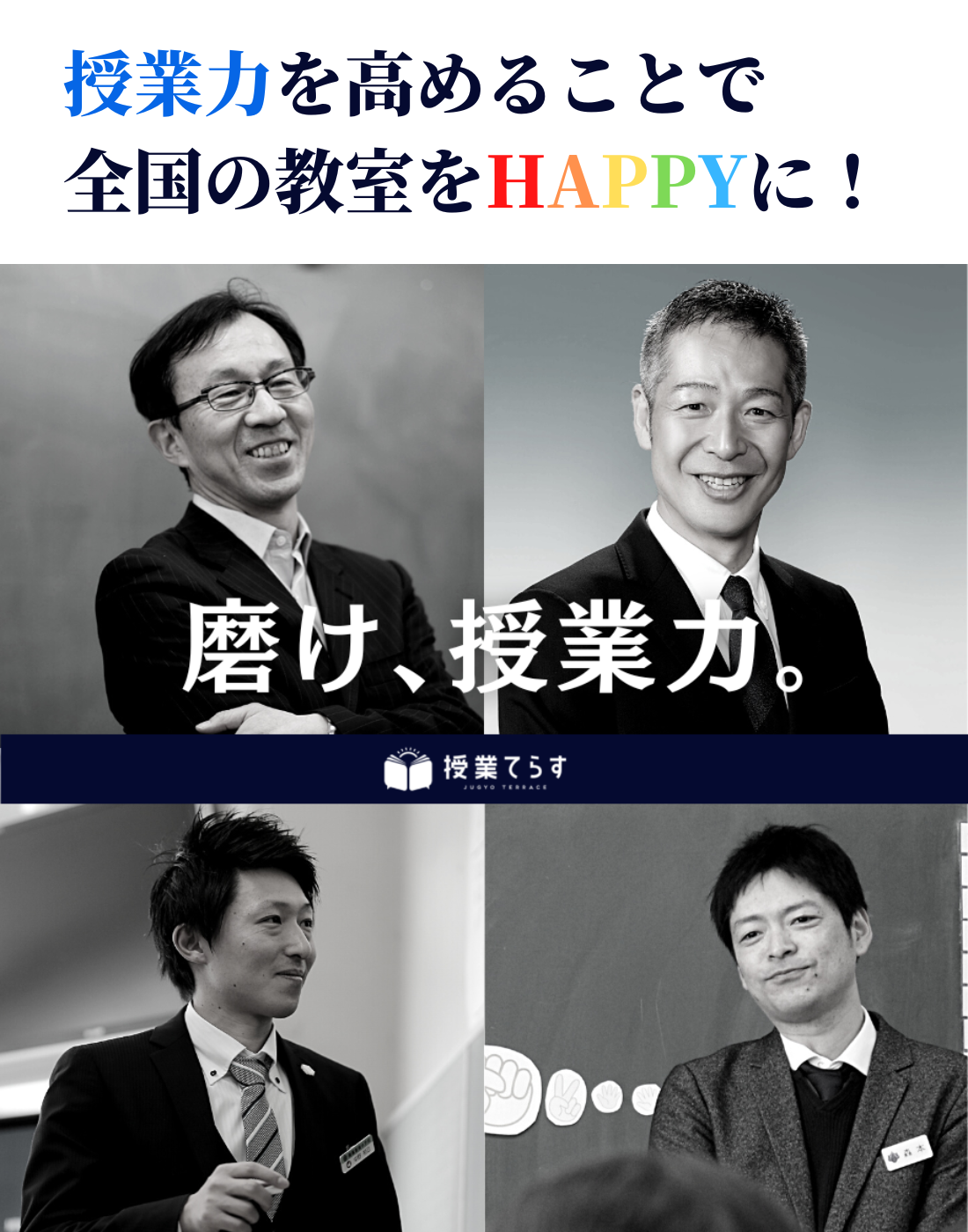 - 自分には才能がないのではないか、教師に向いてないのではないか、と考えたこともありましたが、授業と向き合い、教材と資料と向き合い、そして子どもたちと向き合うなかで少し光が見えました。一人ではきっと掴むことのできなかった光です。本当に、本当に、授業てらすに入ってよかったです。たくさんのサポートと、ご指導をいただき、ありがとうございました。みなさんのおかげで、教室はいまHAPPYが溢れています!