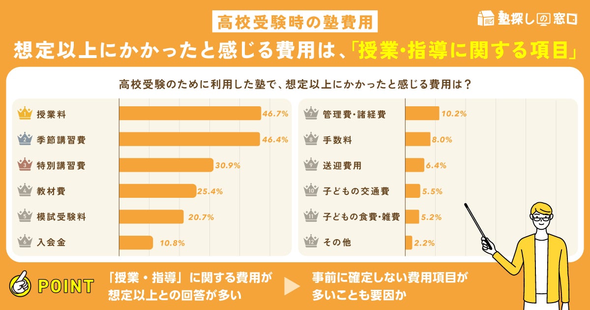 調査対象のうち、塾(集団指導塾:58.0%、個別指導塾:38.1%)を利用したと回答した保護者に、「塾でかかった費用のうち、想定以上に高かった費用項目」を尋ねました。結果は以下のとおりです。