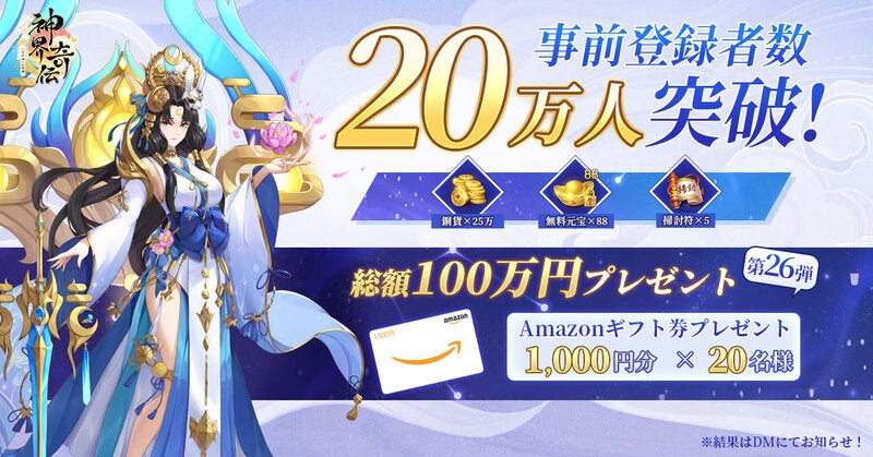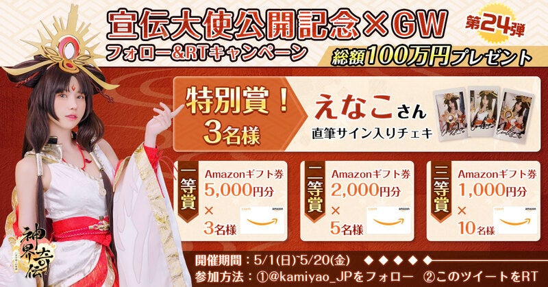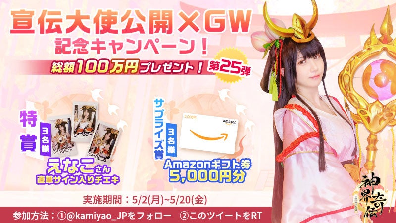 なお、『神界奇伝』公式Twitterでは、えなこさんが宣伝大使就任とGW祝いを合わせて、限定キャンペーンを開催中です。事前登録受付期間中、『神界奇伝』公式Twitterでは随時ゲームに関する最新情報&キャンペーン情報を公開します。現在、本作は事前登録絶賛受付中で、事前登録者数が20万人ノルマを突破しました。興味がある方は是非、公式Twitter「@kamiyao_JP 」をフォローして、最新のキャンペーン情報をチェックしてみてください!