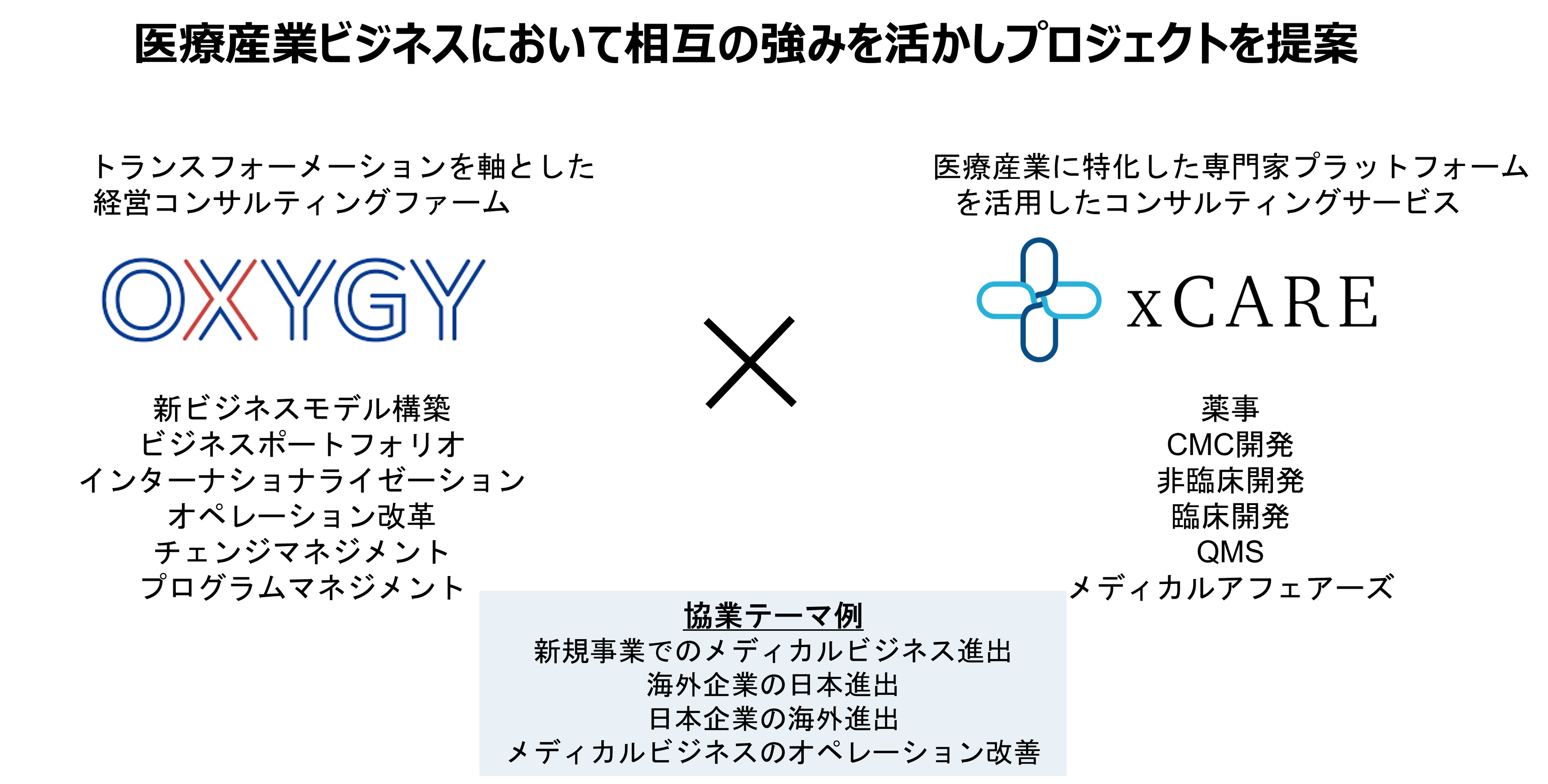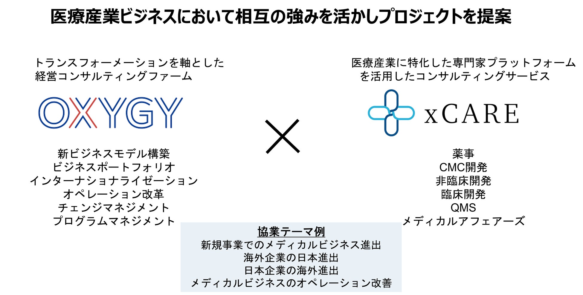 OXYGY社は変革による戦略策定や組織・人財改革、新規事業創出に伴う各種変革プログラムの立上げと、その実行面での伴走及びプログラムマネジメントに強みを持つコンサルティングファームです。そこにxCAREの専門家集団が加わることでヘルスケア関連領域における特異的な薬事や臨床開発等の領域での戦略やビジネスモデルから、オペレーションの改革のための計画から実行までの一連の流れの支援を可能にするというようなシナジーが期待できます。例えば新たに医療機器ビジネスの創出を検討している企業の新規事業創出の全体のプログラムマネジメントから戦略策定や組織作りのプロセスをOXYGY社が支援する一方でプログラムから創出された具体的な製品化までのプロセスをxCAREが担うといった連携が可能になります。このスキームはヘルスケア関連業界におけるスタートアップ企業から大企業まで、また日本から海外に進出を検討している企業や海外企業の日本進出等国内外問わずグローバルレベルでの支援を可能とします。