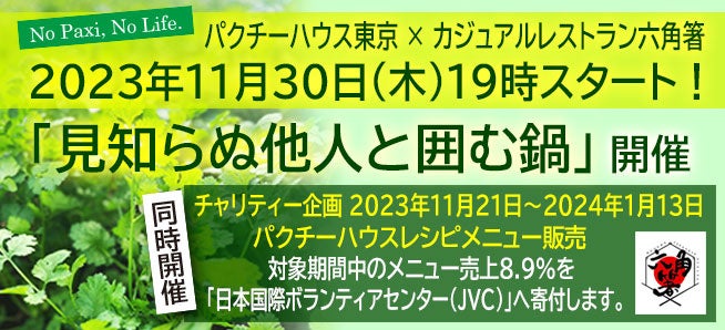 チャリティーイベント【パクチーハウス六角橋】開催!!横浜・白楽「六角箸」を会場に「パクチーハウス東京」で知る人ぞ知る人気企画、席は相席【見知らぬ他人と囲む鍋】を2023年11月30日(木)開催!