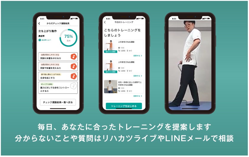 あなたに合ったトレーニングを自宅でいつでも自分のペースで続けられる「リハカツ」スマホアプリをご提供。