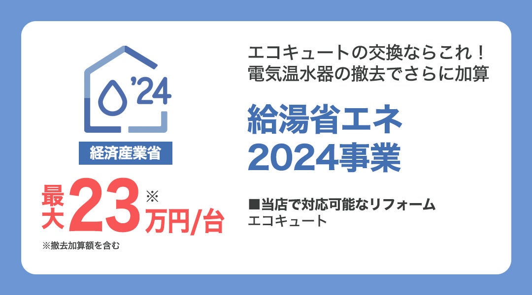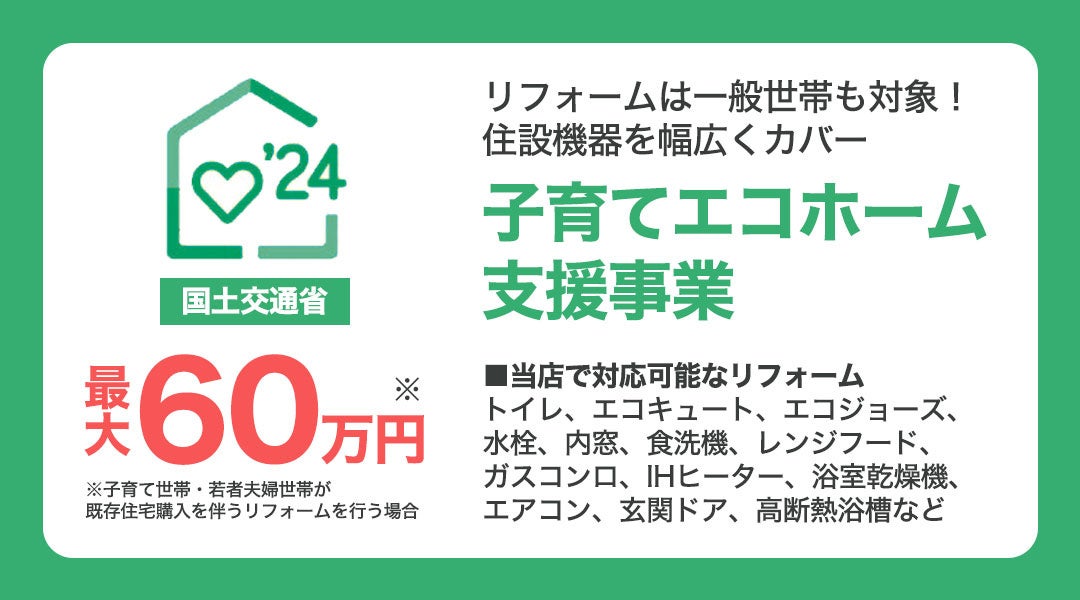 このうちトイレ・水栓・ガスコンロ・IHヒーター・食洗機・レンジフード・ガス給湯器・エコキュート・エアコン・浴室暖房乾燥機・内窓・玄関ドア・高断熱浴槽については「子育てエコホーム支援事業」の補助対象です。また、内窓・玄関ドアについては「先進的窓リノベ2024事業」、エコキュートについては「給湯省エネ2024事業」もご利用いただけます。