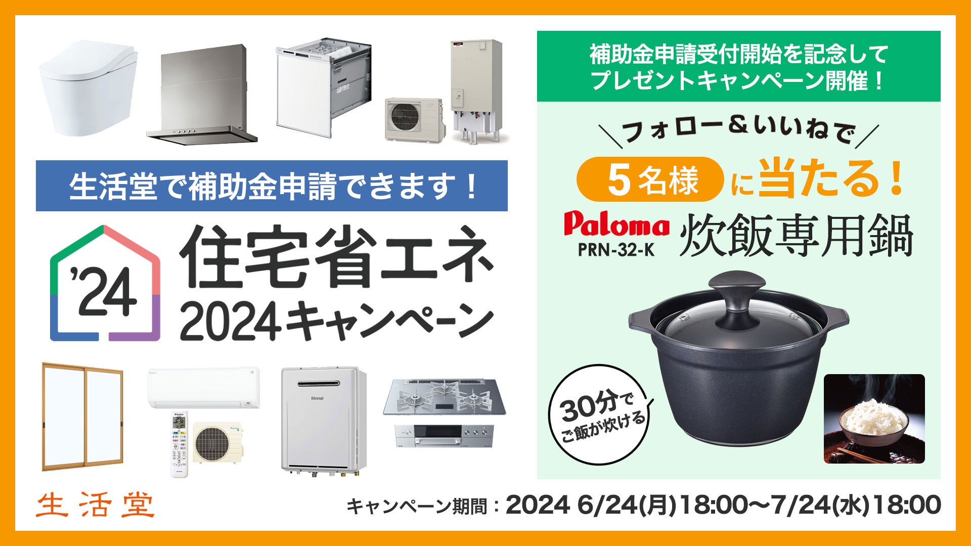 生活堂が住設機器の買い替えに使える「住宅省エネ2024キャンペーン」の補助金申請受付を開始!公式Instagramをフォロー&いいねで炊飯鍋が当たるプレゼントキャンペーンも同時開催!