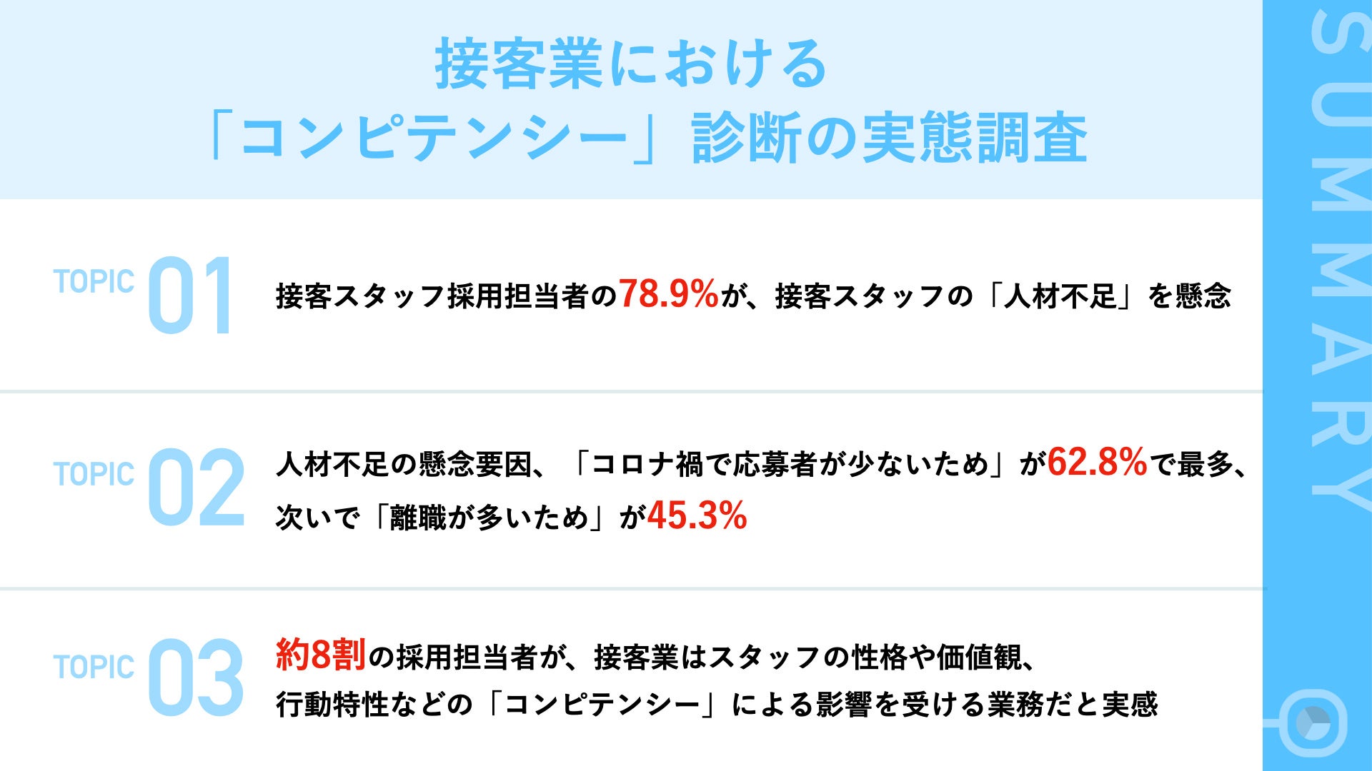- 約8割の採用担当者が、接客業はスタッフの性格や価値観、行動特性などの「コンピテンシー」による影響を受ける業務だと実感