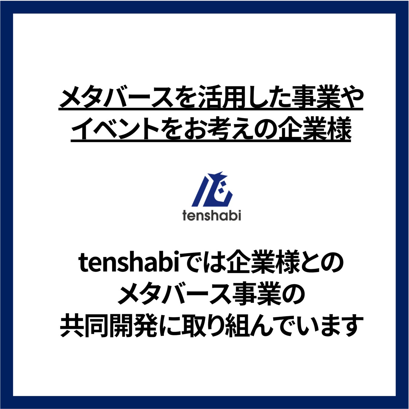 株式会社tenshabiではMETANAVI(メタナビ)という名称でメタバースの総合サービスを展開しています。メタバース就職事業、メタバース建築事業、メタバースイベント事業にはじまり、今後さまざまな分野へとサービスを広げてまいります。メタバースに興味がある方はぜひtenshabiにお集まりください。