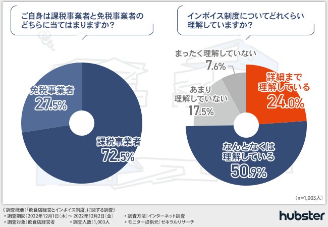 そこで今回、デリバリーサービスを一元管理するプロダクト『ハブスター(Hubster)』(https://www.tryhubster.jp/)を運営するTokyo Smart Restaurants合同会社は、飲食店経営者を対象に、「飲食店経営とインボイス制度」に関する調査を実施しました。