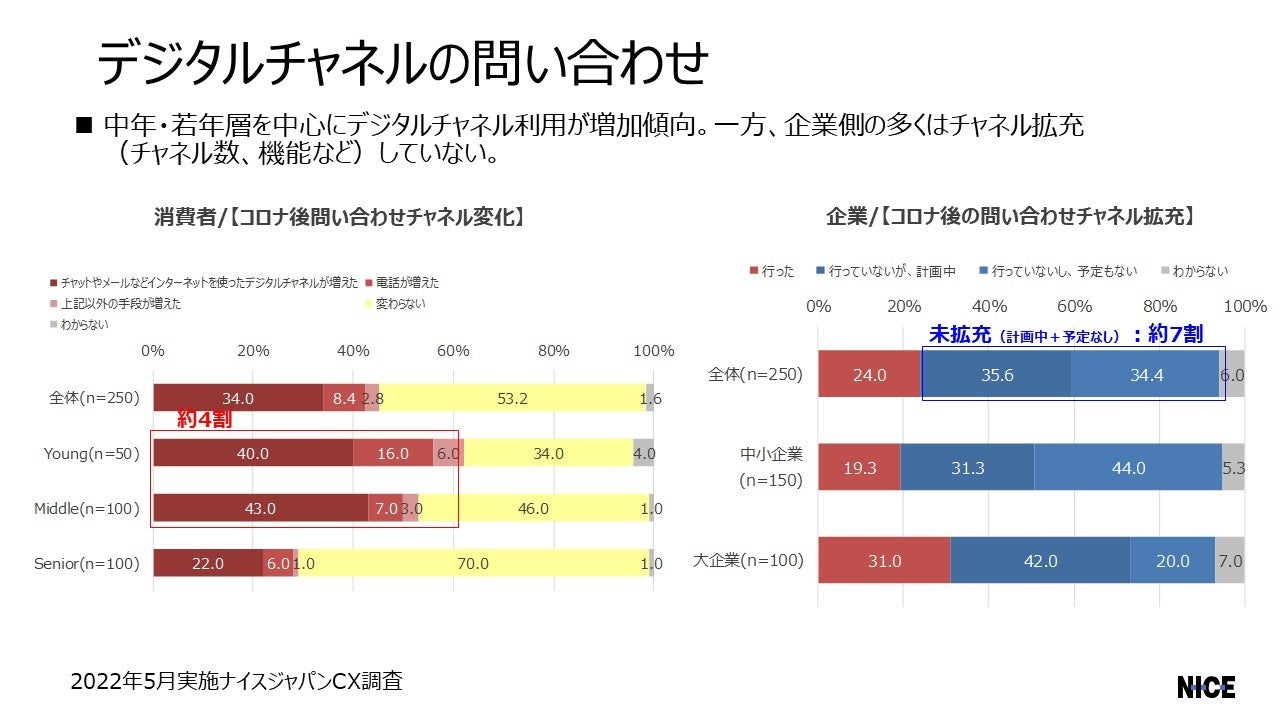 AIやRPAを活用した、シームレスな顧客接点作りを行いクラウドベースで、企業のデジタルトランスフォーメーション(DX)を可能にするNICE(Nasdaq:NICE、日本法人 ナイスジャパン株式会社 社長 安藤竜一)は本日、同社が実施したコンタクトセンターCX調査の結果を発表しました。昨年の調査に引き続き2度目となる本調査は、コロナウイルス拡大により発生した店舗の閉店・臨時休業や働き方の変化に伴う問い合わせ行動の変化や購買行動の変化、消費者の認識と企業側のギャップを浮き彫りにしました。