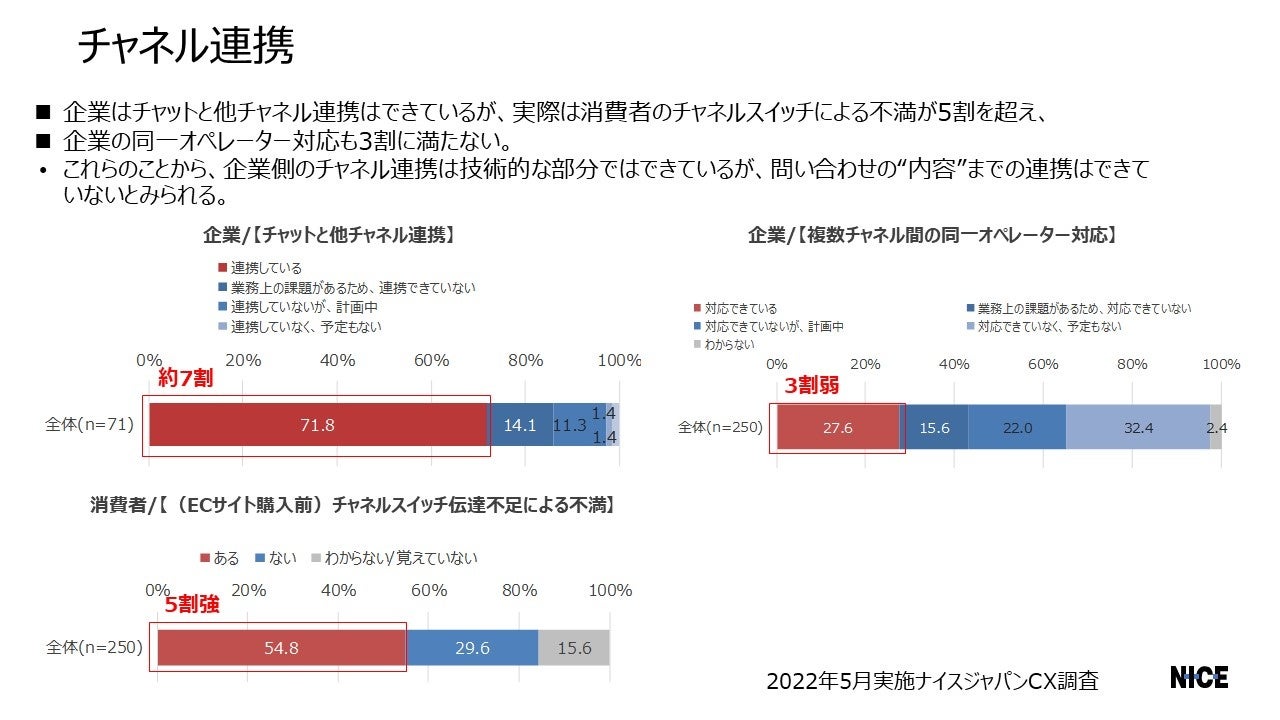 チャットから電話への切り替えなどの際に、同じことをもう一度説明しなくてはならず、フラストレーションを抱えている消費者が50%以上いることがわかりました。ですが、同一の担当者(オペレーター)が複数チャネルで問い合わせを引き継ぐ機能について、実現できているのは中小企業で23.3%、大企業でも34%にとどまりました。