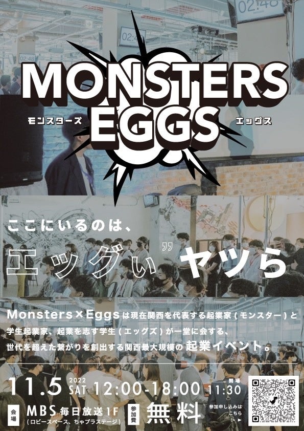 「日本の若者に“人生の選択肢“を示す」をビジョンに掲げる、株式会社やるかやらんかとMonsters×Eggs学生実行委員会が、2022年11月5日(土)に、MBS毎日放送1階にて【Monsters×Eggs】を開催します。