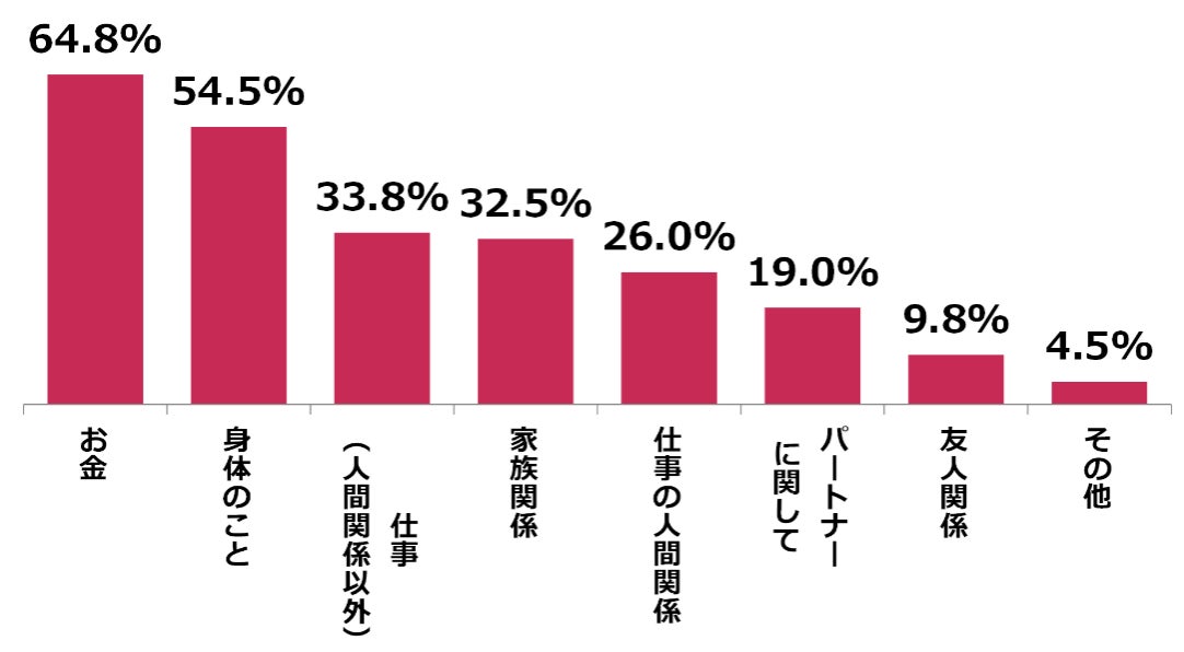 その結果「お金」64.8%、「身体のこと」54.5%それぞれ過半数以上が悩んでいることが明らかに。以下「仕事(人間関係以外)」33.8%、「家族関係」32.5%とさまざまな悩みが続きます。