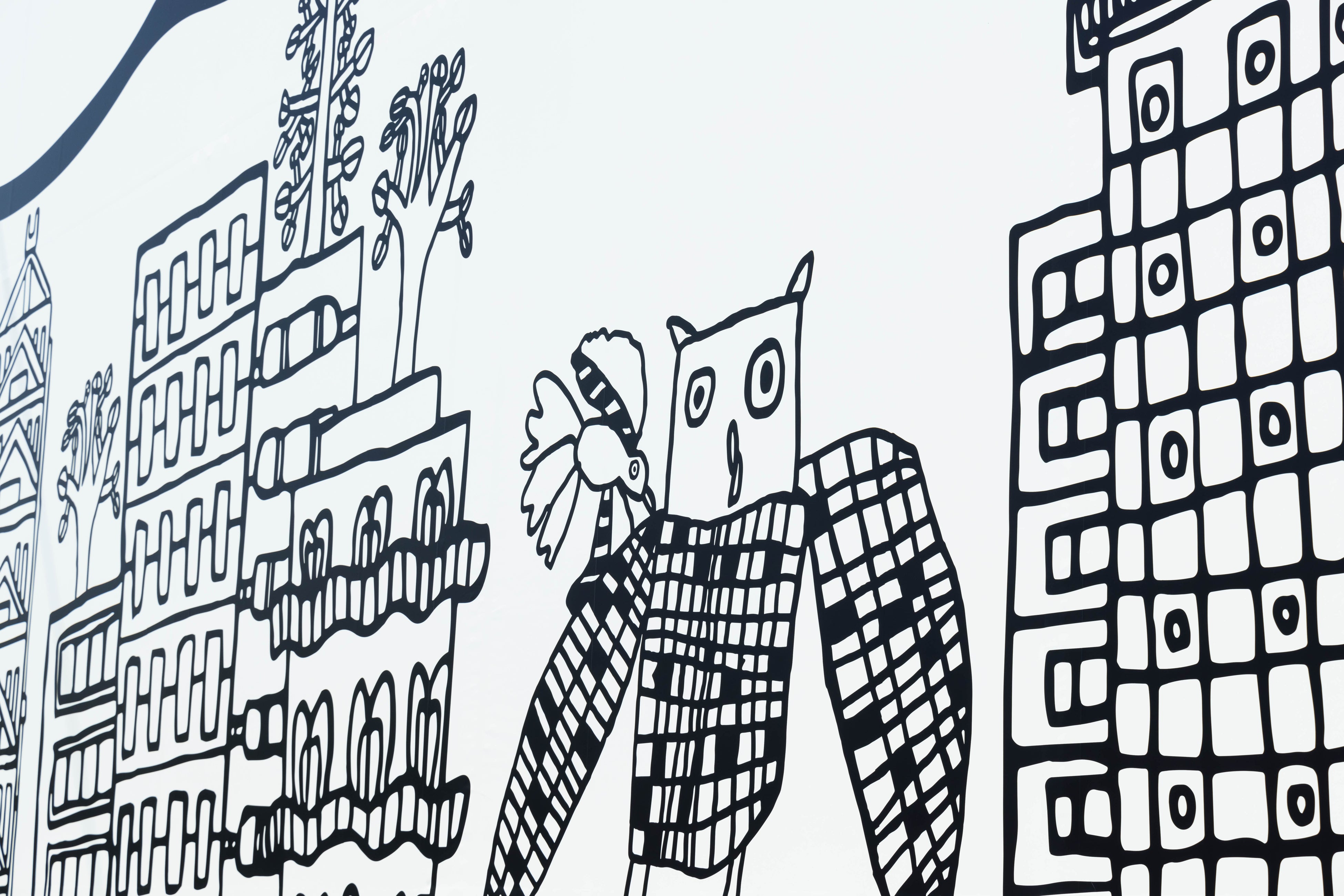 デザインには、障害者とアートで仕事をするデザインスタジオ【HIBIGEI】と連携しているアート福祉施設の皆様の作品を活⽤。アーティストの作品それぞれが持つ異なる世界観を一つの画面上で掛け合わせ、膜構造で抱括していく街を表現しています。