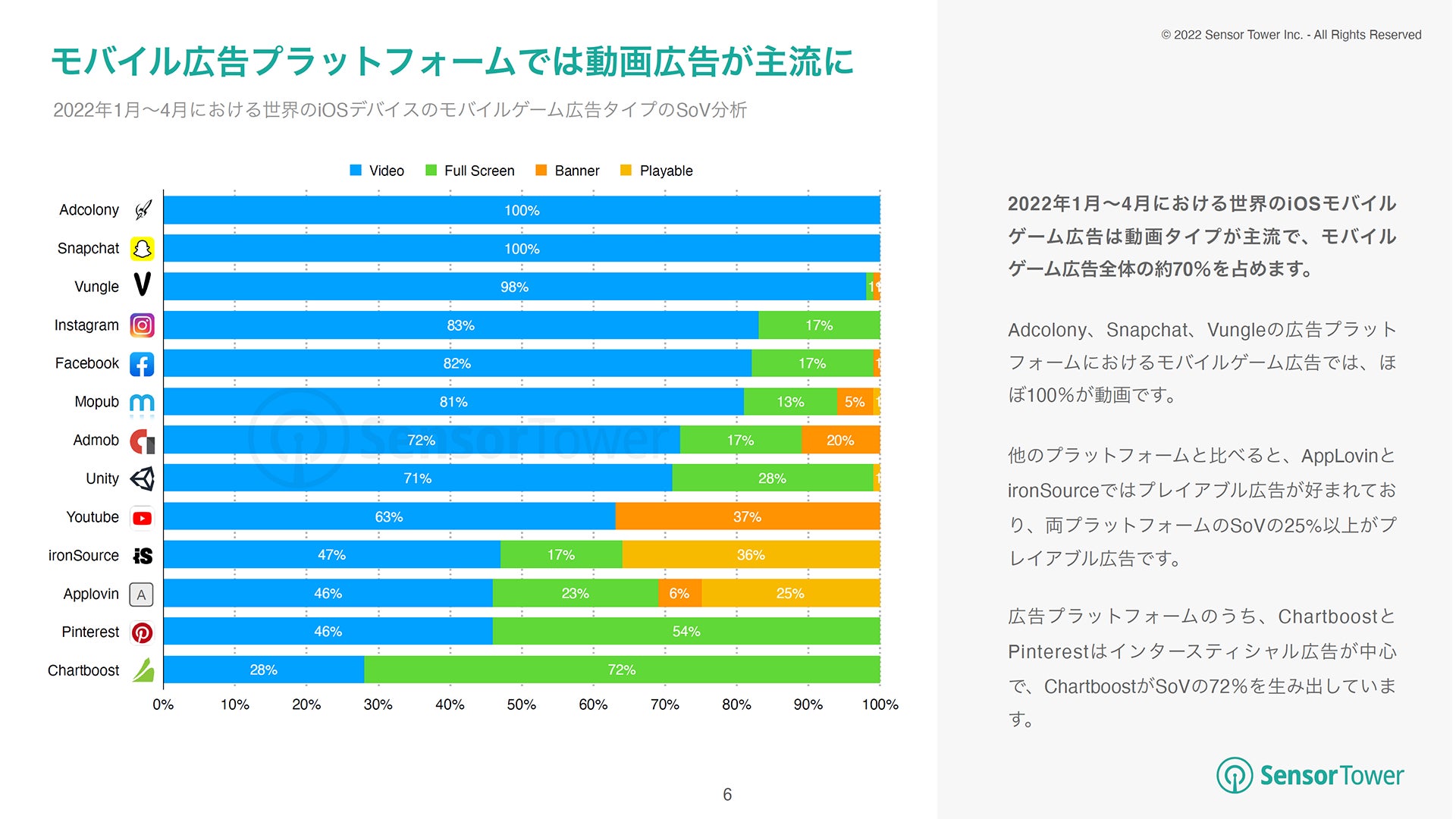 2022年1月~4月における世界のiOSモバイルゲーム広告は動画タイプが主流で、モバイルゲーム広告全体の約70%を占めます。Adcolony、Snapchat、Vungleの広告プラットフォームにおけるモバイルゲーム広告では、ほぼ100%が動画です。