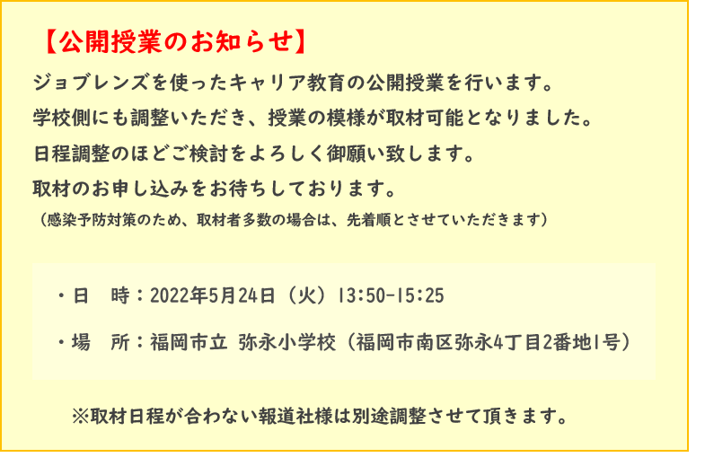 〜ジョブレンズを使った特別公開授業を、 福岡市立弥永小学校にて5/24実施決定〜