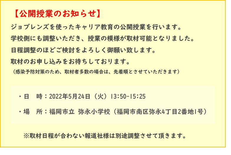 〜ジョブレンズを使った特別公開授業を、 福岡市立弥永小学校にて5/24実施決定〜