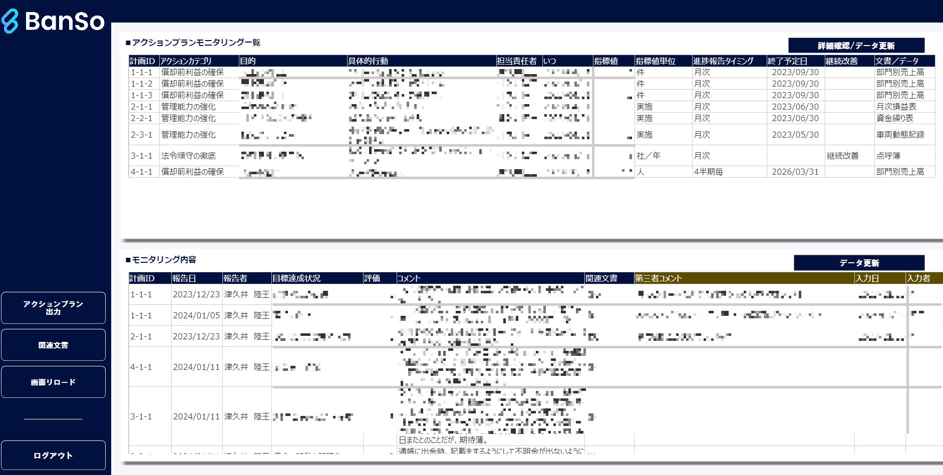 陸王:私の場合、金融機関さんへの情報共有、報告に「BanSo」から出力される「モニタリングシート」を使っています。計画に対する実施状況を日々入力し、SDXCさんからの第三者コメントを含めて行動を確認し振り返ることで、金融機関さんへの説明に役立てています。