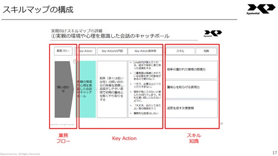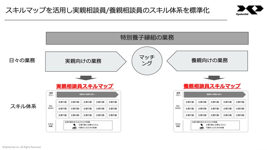 特別養子縁組に係る相談業務は、相談者の状況に応じ様々なスキルが必要とされています。しかし、相談員の経験値によって相談援助スキルに差があること、対人支援のスキルは言語化しづらいことなどから、スキル共有が難しい実態がありました。そこで相談員のスキルを可視化するために、相談員にヒアリングを行いXpotentialのイネーブルメントの仕組みに相談員スキルを落とし込み、スキルマップを作成いたしました。