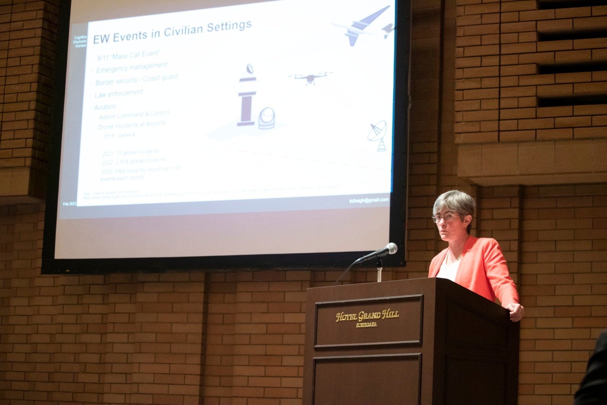 米国国防総省の顧問である電子戦の権威、カレン・ジータ・ヘイグ博士が来日し、弊社主催の講演会が開催されました。ヘイグ博士の著書「Cognitive Electronic Warfare: An Artificial Intelligence Approach」の日本語訳版「電磁波戦」発売を記念して、2023年4月13日(木)にグランドヒル市ヶ谷で講演が行われました。講演では、ヘイグ博士が持つ豊富な経験と知識を活かし、電磁波戦に関する最新の技術と革新的なアプローチについて語りました。多くの参加者が電子戦の第一人者から直接学ぶ貴重な機会を得られ、情報交換の場としても大変有意義な時間となりました。
