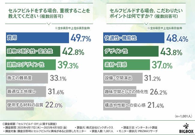 「セルフビルドをする場合に重視すること」を尋ねたところ、『費用(49.7%)』が最多で、『建物の耐久性・安全性(42.8%)』『建物のデザイン性(39.3%)』となりました。