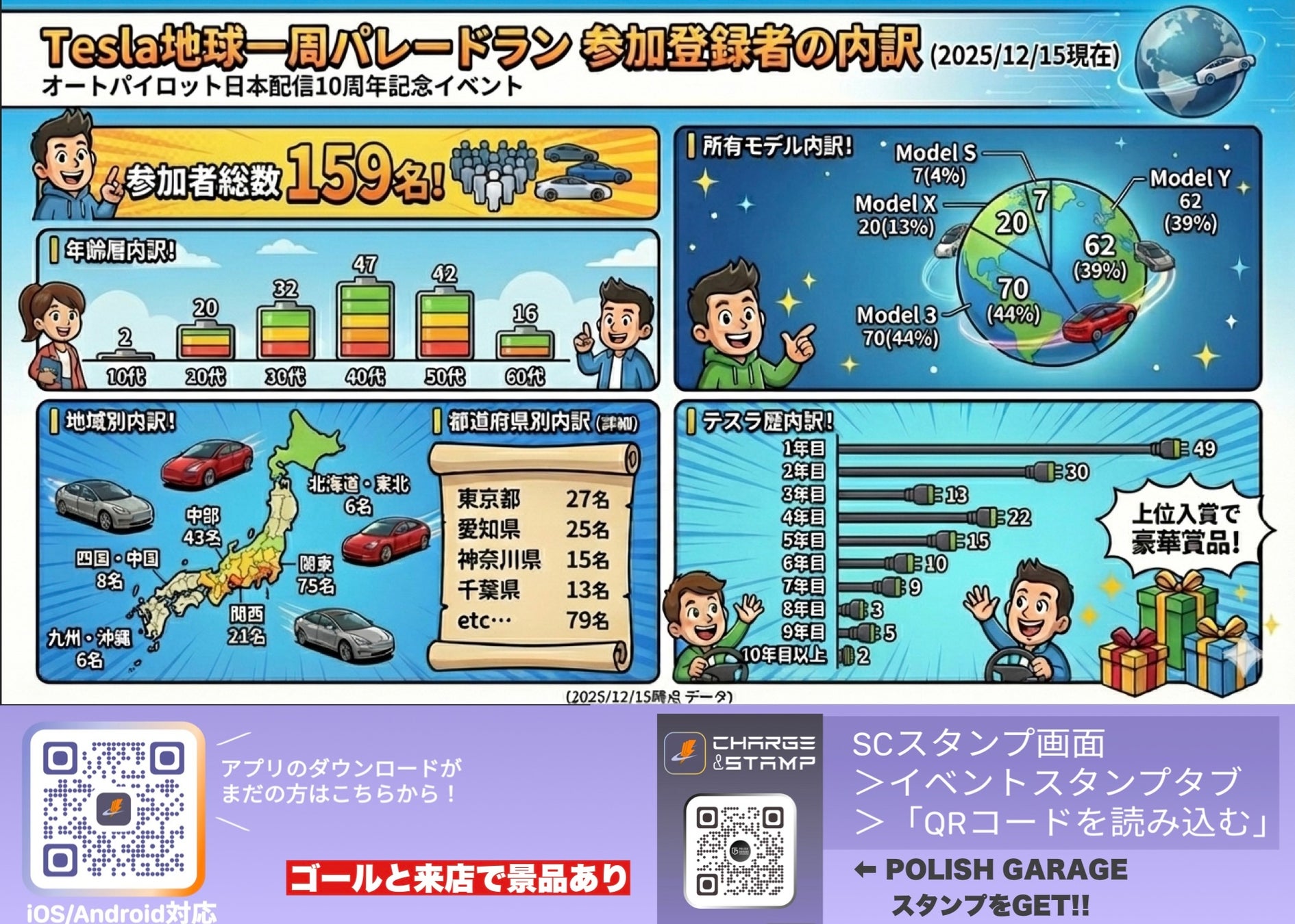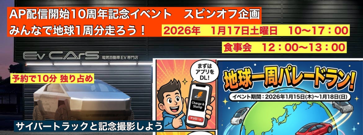 2025年12月13日(土)・14日(日)の2日間、AP配信開始10周年を記念した「地球1周パレードラン」イベントに先立ち、全国テスラオーナーによる“テスト走行”が実施されました。