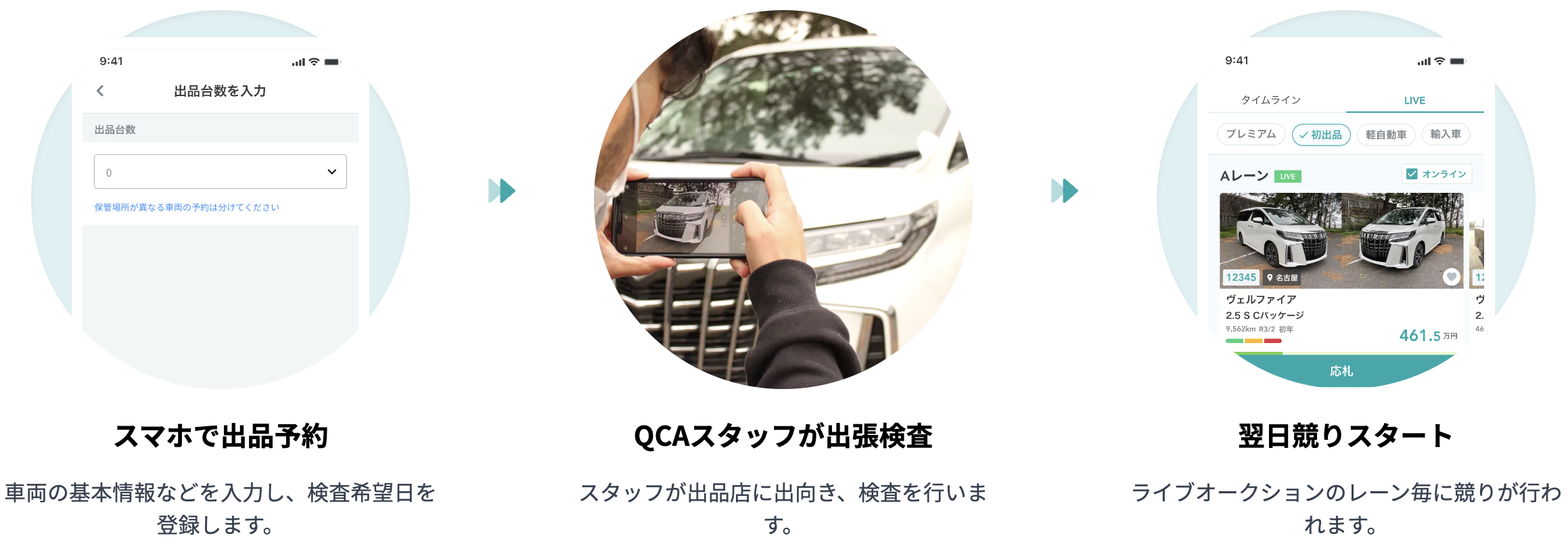 そこで当社では、検査時に高画質かつ豊富な写真を撮影し、落札の判断に寄与する車両情報をスマホから確認できる、業者向けオンライン中古車オークション「QCA」を開発することにいたしました。検査と同時に下見を実施することで効率化を実現し、場所の制約にとらわれず入札、落札が可能です。最短翌日に再出品できる仕組みを整えることで、取引スピードの向上に貢献いたします。