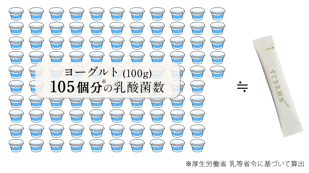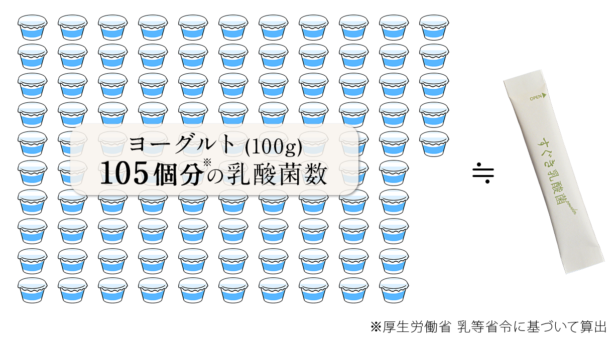 【計算式】(すぐき乳酸菌パウダーの乳酸菌数)1,000億個÷(ヨーグルト100gに少なくともいる乳酸菌数)9.52億個=(100gのヨーグルト)105.042...個分の乳酸菌