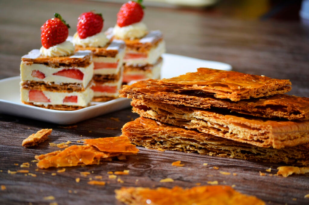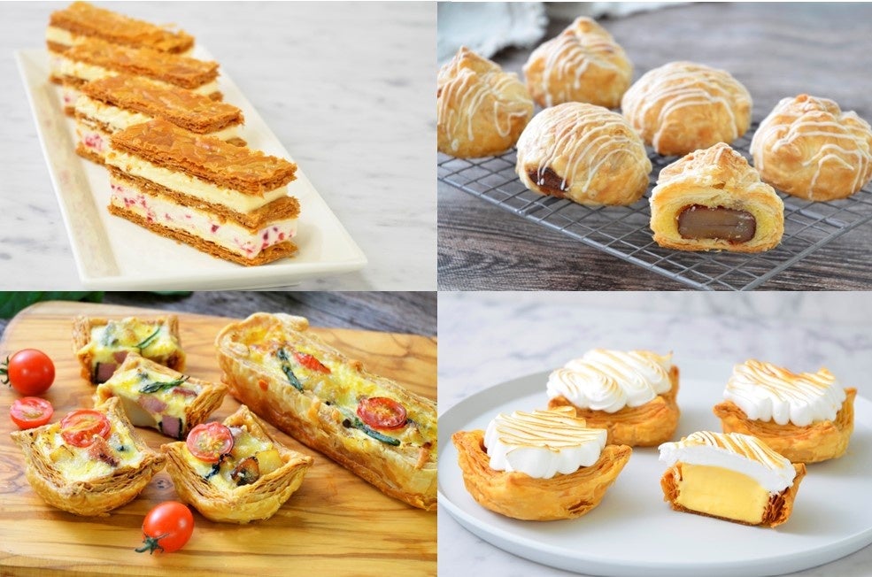 圧延する設備も必要なく、解凍・分割・成型して焼成するだけです。カットするサイズや成形は自由自在。ミルフィーユなどの洋菓子や、キッシュなどのセイボリーパイまでさまざまな商品にお使いになれます。