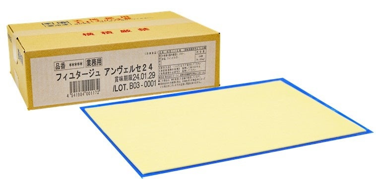 【フィユタージュ アンヴェルセ24】は油脂で生地を包み込むフランス伝統の「アンヴェルセ(逆折)製法」※で丁寧に作り上げたシート状の冷凍パイ生地です。同製法で作り上げた既存の【フィユタージュ・トラディション】のプレミアムタイプです。フランス産小麦粉とオールバターで仕込んだ、サクサクハラハラ、ほどけるような軽やかな食感と高級感漂うバターリッチな味わいに仕上げました。