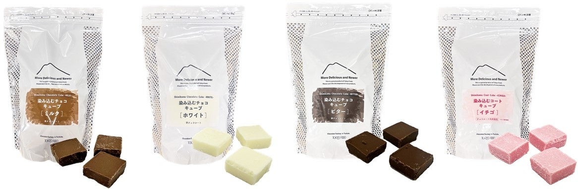 【製品名】 染み込むチョコキューブ[ミルク]、染み込むチョコキューブ[ホワイト]、染み込むチョコキューブ[ビター]、染み込むコートキューブ[イチゴ]